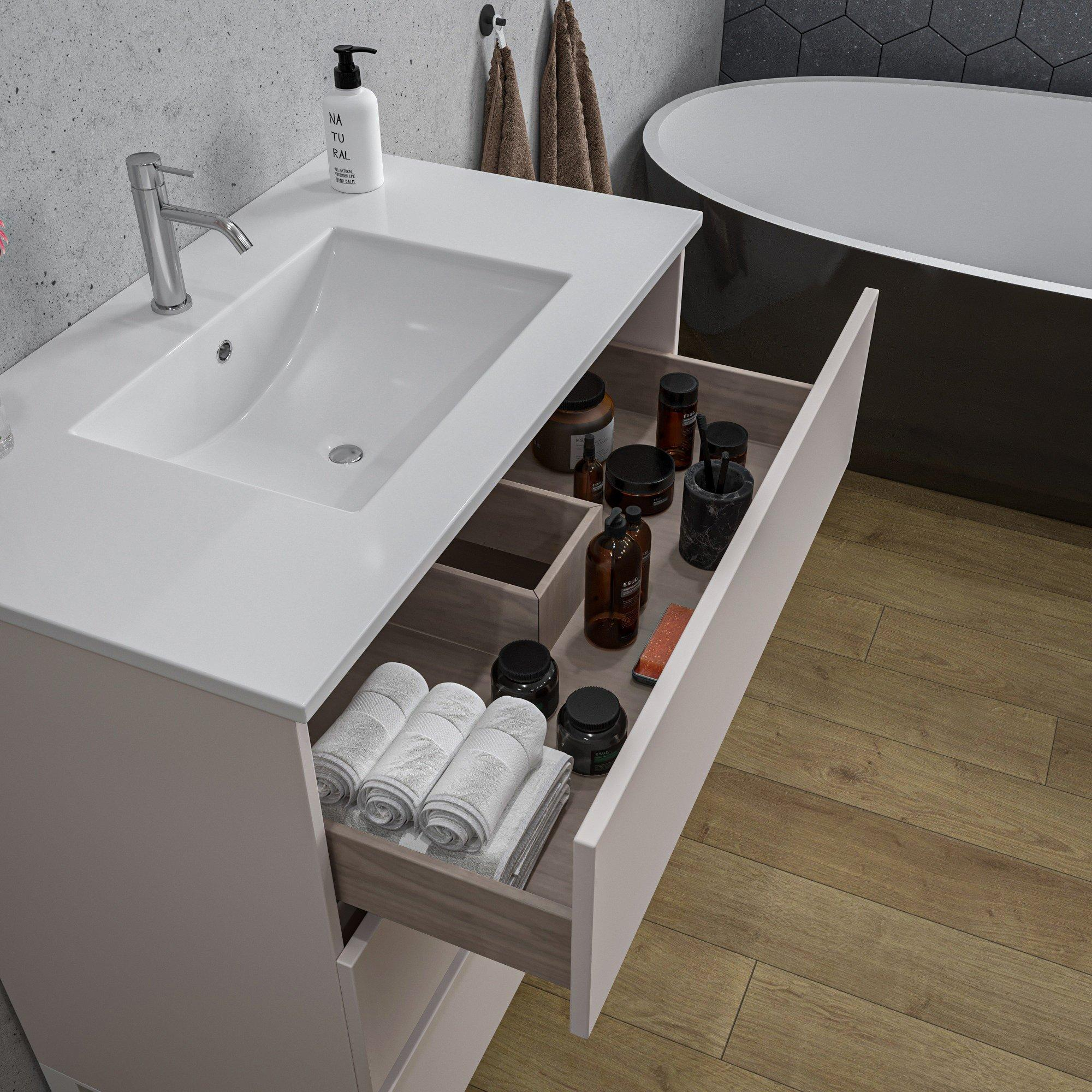 Dit badkamermeubelset is niet alleen een lust voor het oog, maar ook uiterst praktisch in gebruik. Met drie ruime lades biedt het voldoende opbergruimte voor al je badkamerbenodigdheden, van handdoeken tot toiletartikelen. De rechthoekige spiegel zorgt voor een extra touch van functionaliteit, waardoor je jezelf in stijl kunt bewonderen tijdens je dagelijkse routine.