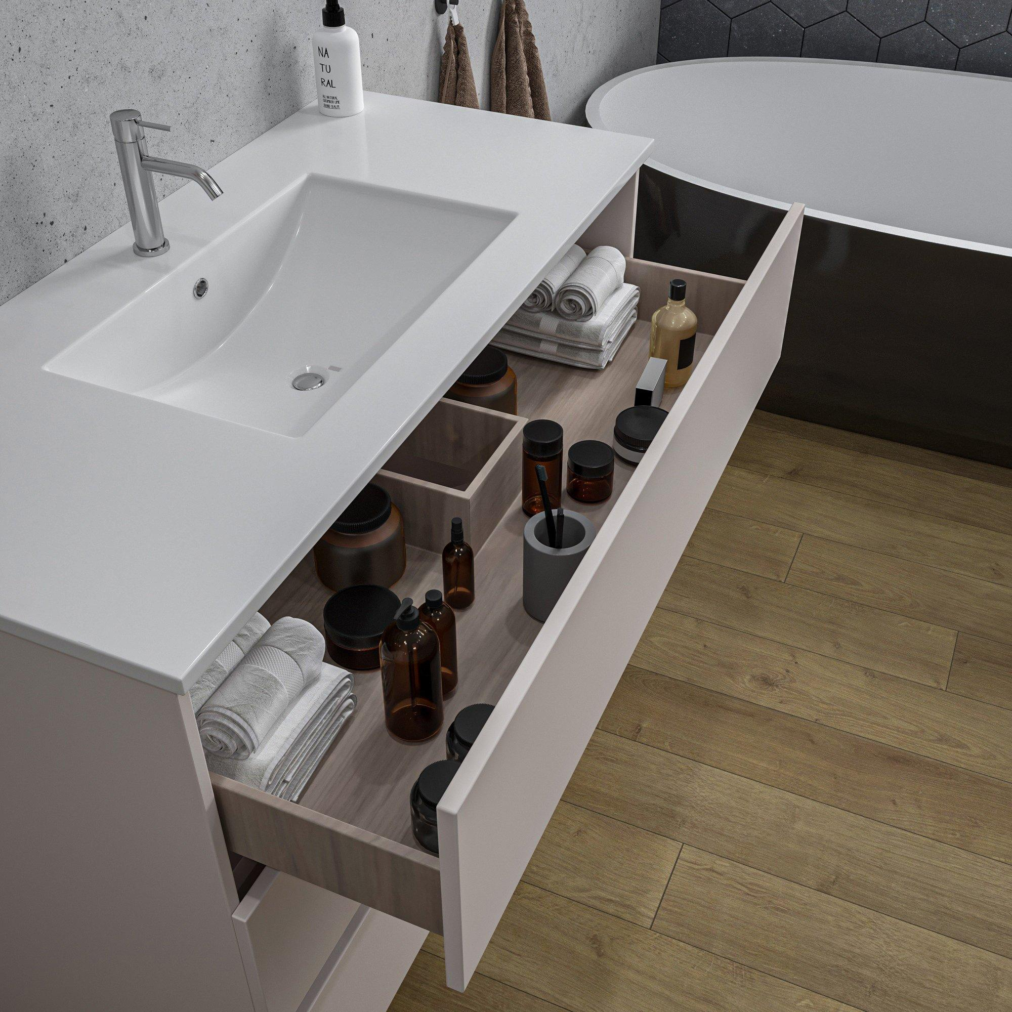 Dit badkamermeubelset is niet alleen mooi, maar ook zeer functioneel. Met drie ruime lades biedt het voldoende opbergruimte voor al je badkamerspullen, van handdoeken tot toiletartikelen. De keramische wasbak is duurzaam en eenvoudig schoon te maken, terwijl het kraangat zorgt voor een gemakkelijke installatie van een kraan naar keuze.