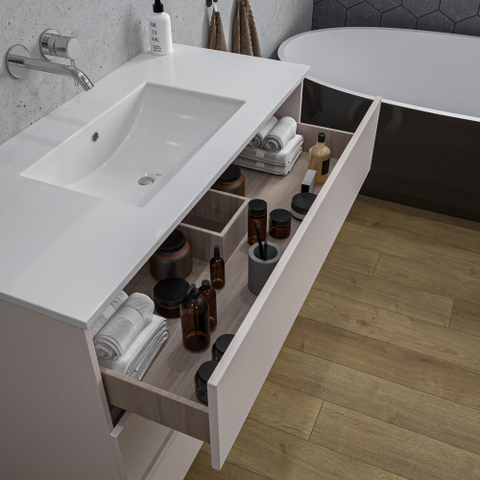 De Saniclass Chaci PLUS Badkamermeubelset straalt een onmiskenbare elegantie uit die je badkamer naar een hoger niveau tilt. Het gebruik van hoogwaardige materialen en de aandacht voor detail maken dit meubelstuk een blikvanger in elke badkamer. De mat cotton (beige) afwerking voegt een warme en uitnodigende sfeer toe, waardoor je elke keer dat je de badkamer binnenstapt een gevoel van luxe ervaart.