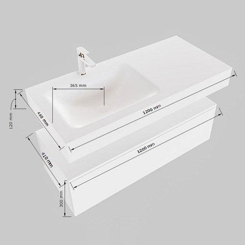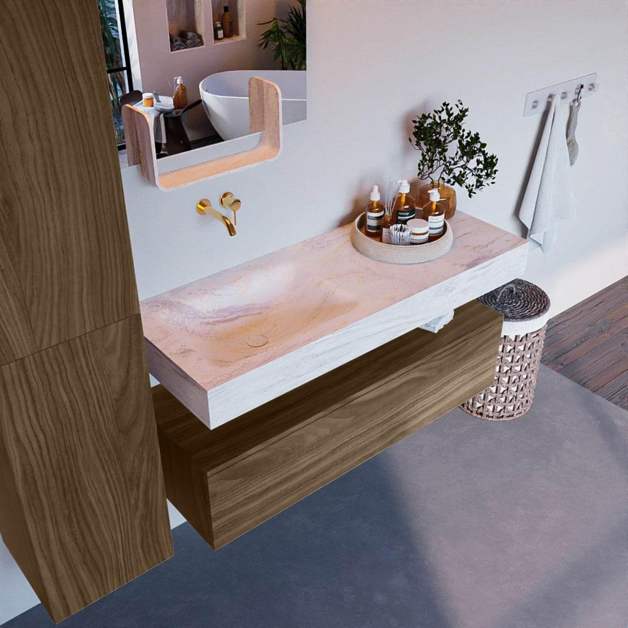 Mondiaz ALAN-DLUX 120cm badmeubel onderkast Mocha 1 lade. Vrijhangende wastafel CLOUD links zonder kraangat. kleur Ostra.