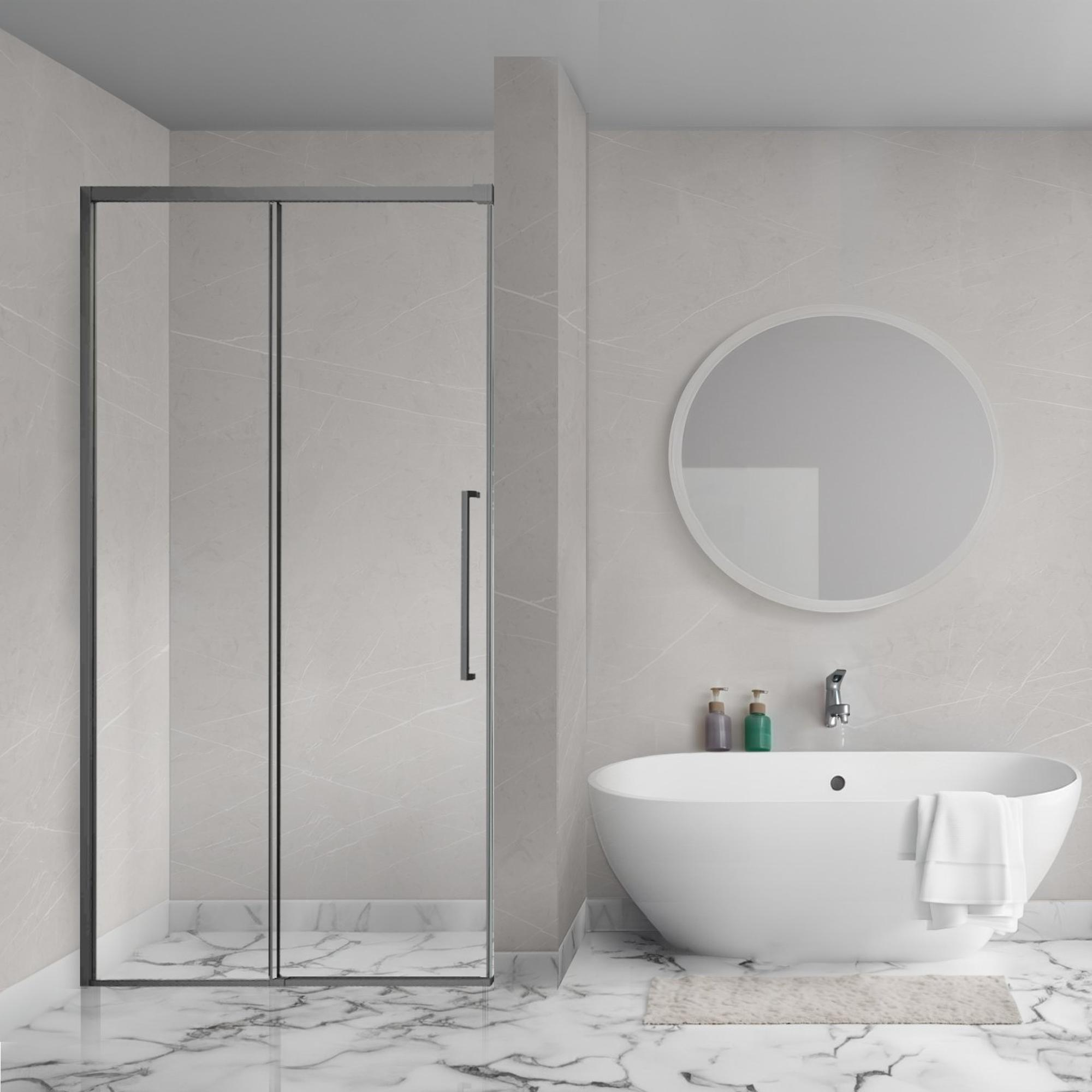 De Aqua Vista Lokla Linea nisdeur straalt stijl en elegantie uit, dankzij het moderne design en de gunmetal afwerking. Het minimalistische frame en de heldere glazen panelen creëren een ruimtelijk gevoel in je badkamer, terwijl de hoogwaardige materialen zorgen voor duurzaamheid en een luxe uitstraling.