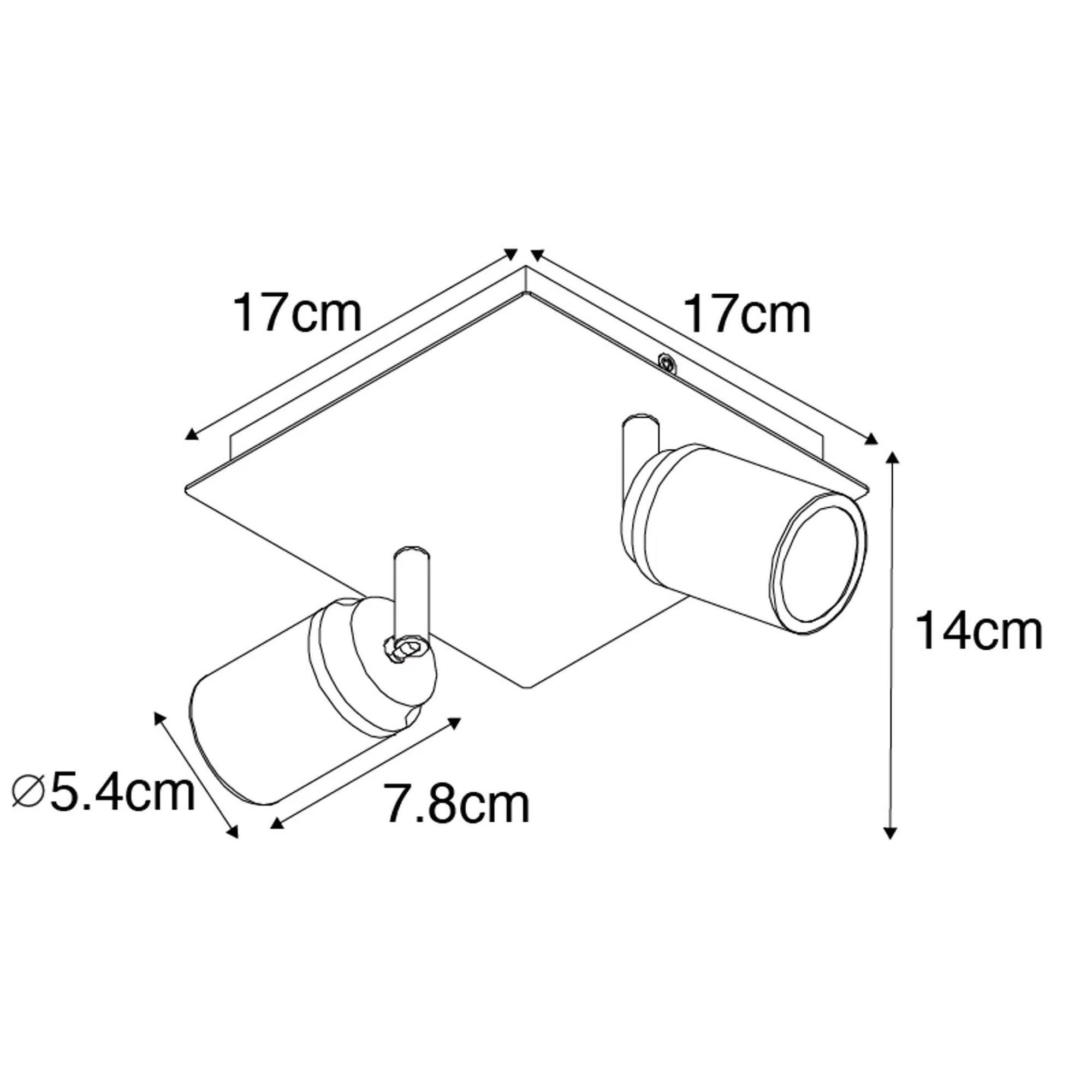 - Compacte vierkante badkamerlamp van 17 x 17 cm met twee richtbare spots voor gerichte verlichting.