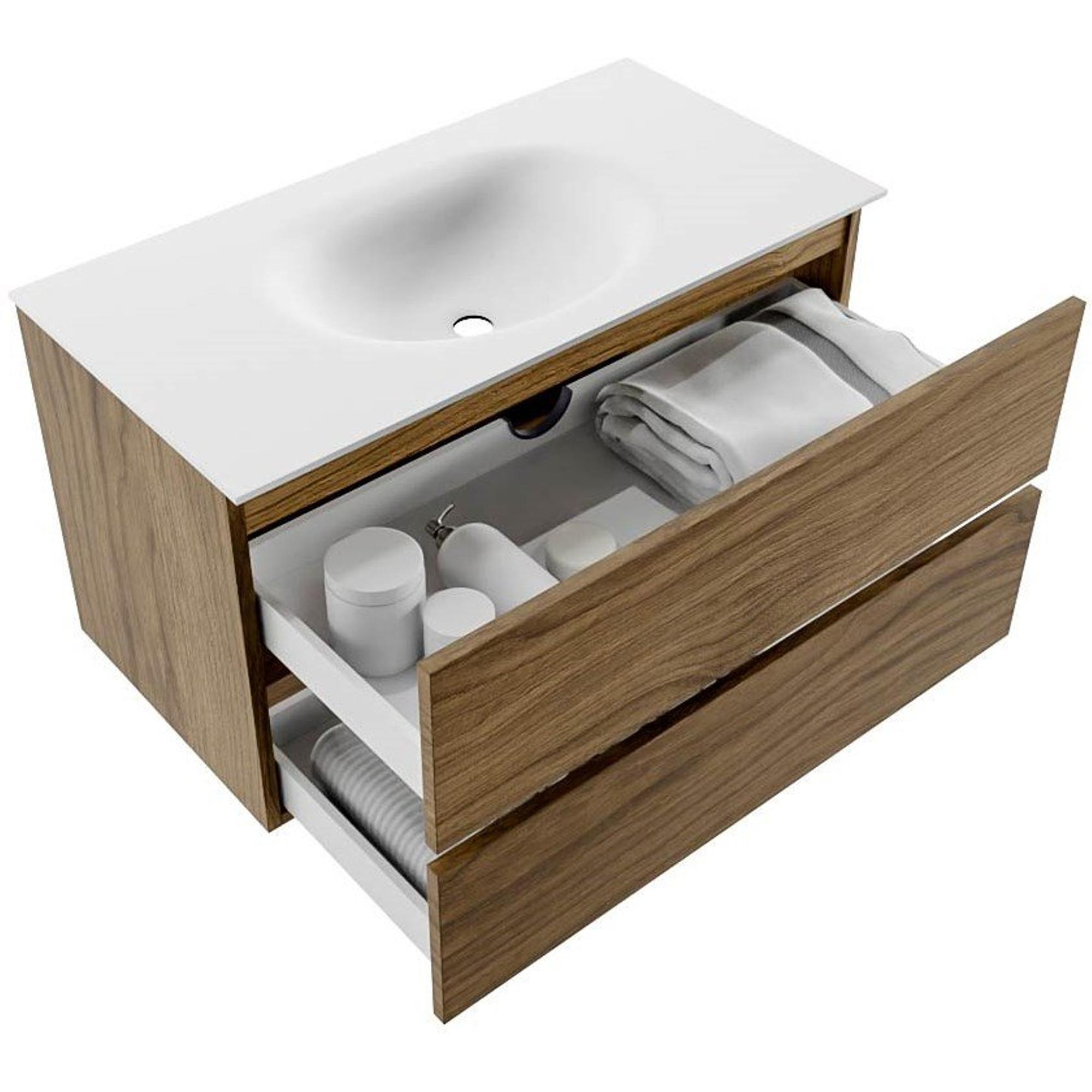 Met twee ruime lades biedt dit meubel volop opbergruimte voor al je toiletartikelen, handdoeken en andere badkameraccessoires. De lades zijn soepel en geruisloos te openen, wat bijdraagt aan een ontspannen sfeer in de badkamer. Het ontbreken van een kraangat in de wastafel geeft je bovendien de vrijheid om zelf de kraan te kiezen die het beste bij jouw stijl en wensen past. Zo creëer je een badkamermeubel dat perfect aansluit op jouw persoonlijke behoeften en dagelijkse gebruik.