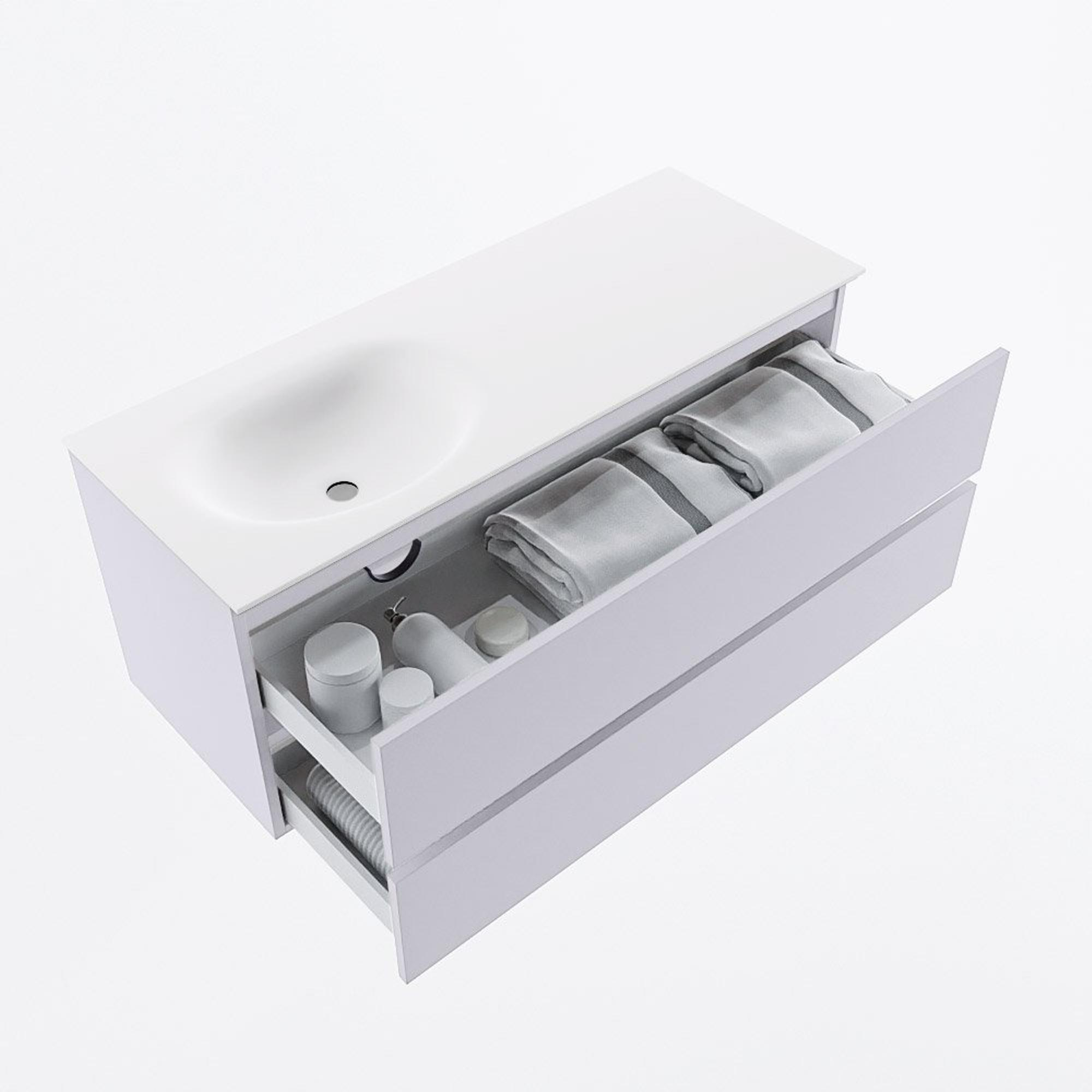 Naast het esthetische aspect is dit badkamermeubel ook uiterst functioneel. Met twee ruime lades biedt het voldoende opbergruimte voor al jouw badkamerspullen. De lades zijn soepel te openen en sluiten, waardoor je gemakkelijk toegang hebt tot al jouw benodigdheden. De wastafel MOON aan de linkerkant is praktisch en stijlvol tegelijk, waardoor dit meubel zowel mooi als functioneel is.