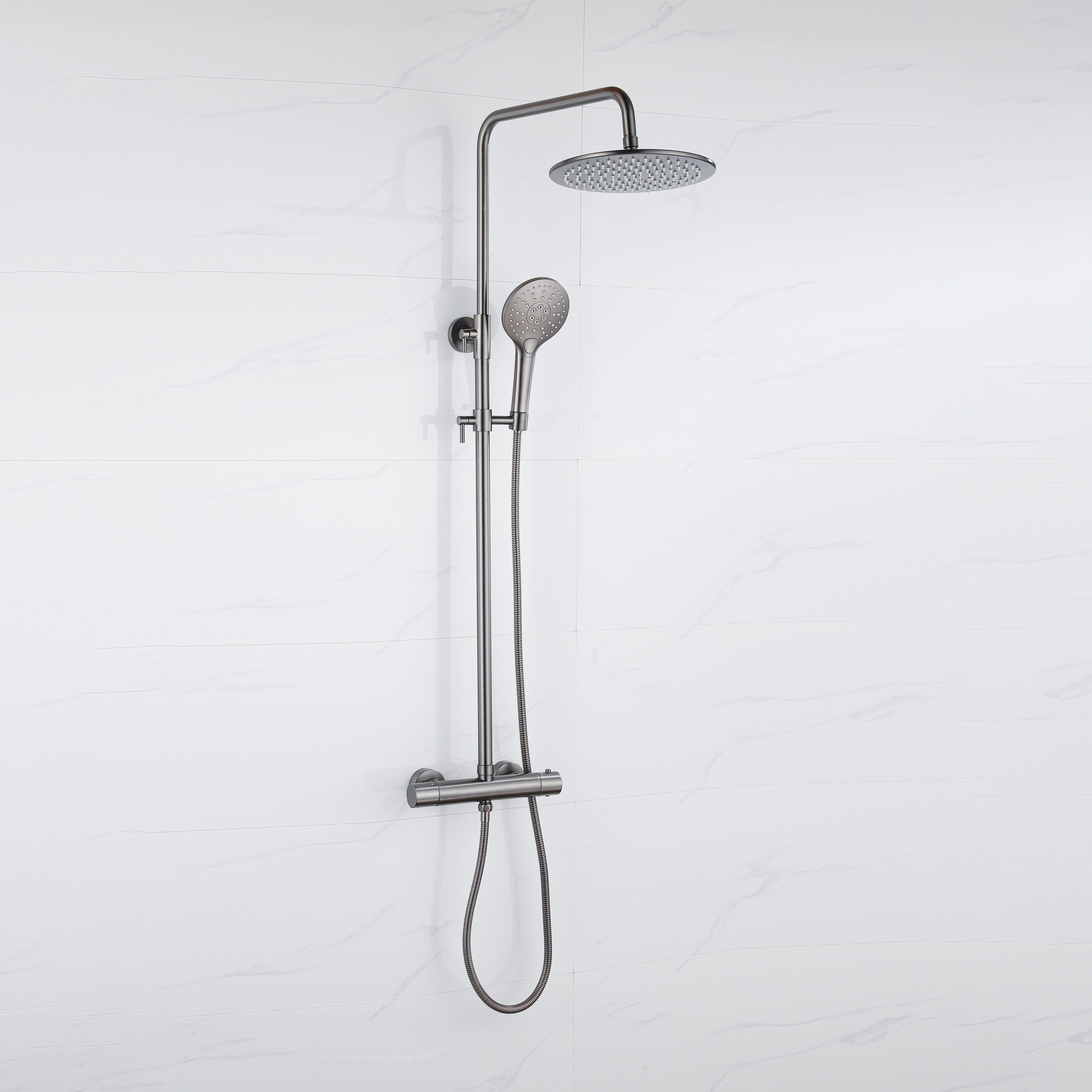 Deze doucheset is vervaardigd uit hoogwaardige materialen, waardoor hij niet alleen mooi is, maar ook duurzaam en robuust. De metalen slang zorgt voor een stevige en betrouwbare verbinding tussen de hoofddouche en de watertoevoer. De gunmetal PVD-afwerking is krasbestendig en gemakkelijk schoon te maken, waardoor de doucheset er langdurig als nieuw uit blijft zien.