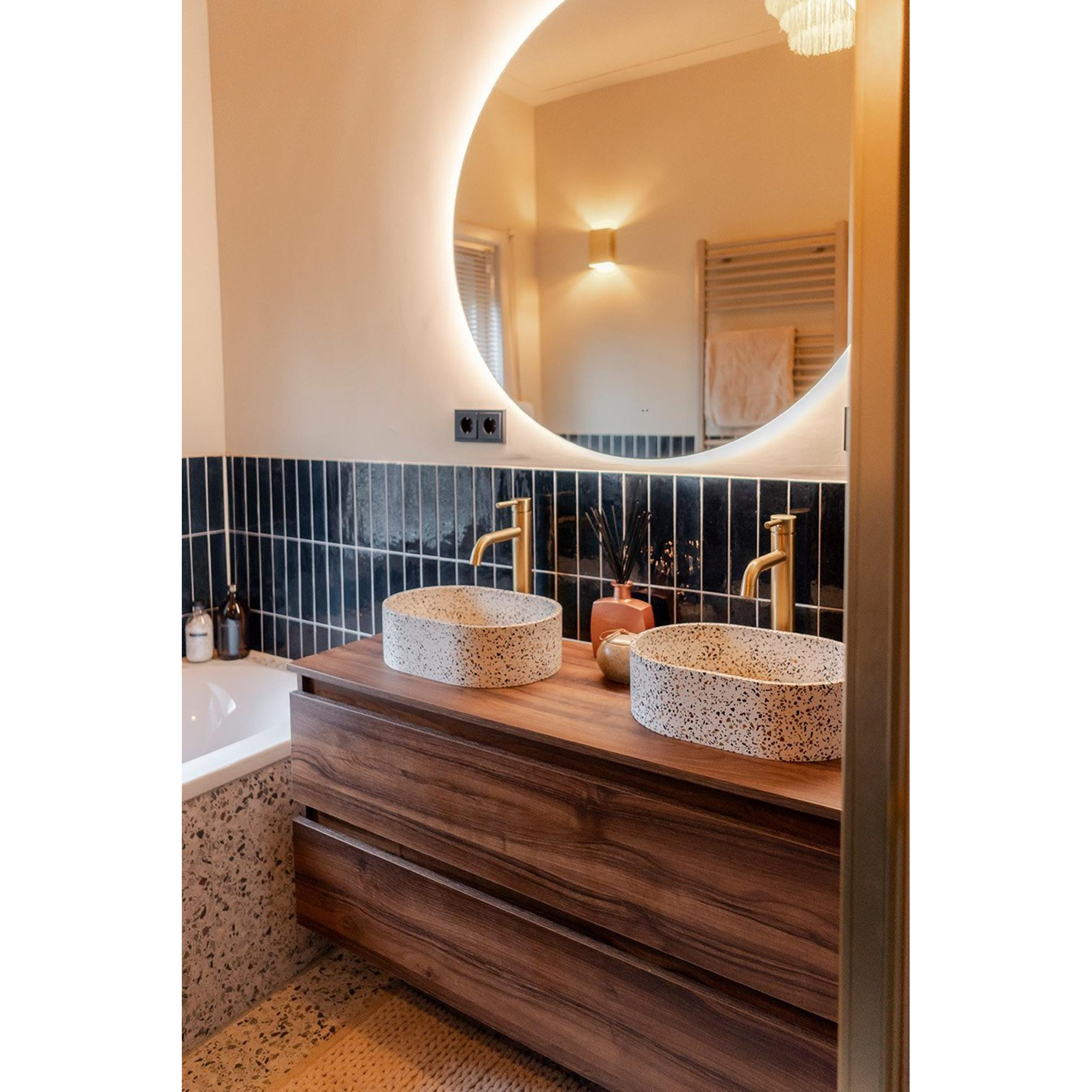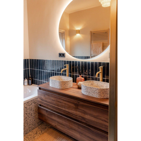 De Saniclass Chaci Badkameronderkast straalt stijl en elegantie uit dankzij zijn slanke ontwerp en greeploze afwerking. Het noten hout voegt warmte en karakter toe aan de badkamer, terwijl de 2 lades voldoende opbergruimte bieden voor al je badkamerbenodigdheden. Deze kast is perfect voor diegenen die op zoek zijn naar een eigentijdse en verfijnde uitstraling in hun badkamer.