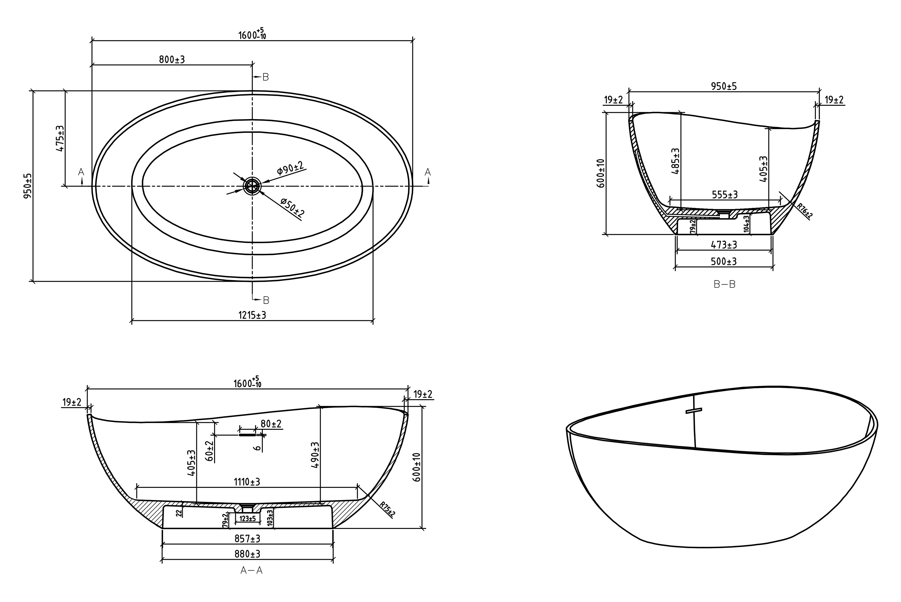 Wiesbaden Waive vrijstaand ligbad 160 x 95 cm solid surface mat wit