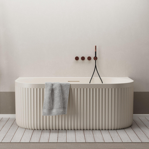 Dit back-to-wall bad straalt een majestueuze sfeer uit dankzij zijn imposante afmetingen en robuuste rock texture afwerking. Het design is zowel eigentijds als tijdloos, waardoor het perfect past in diverse badkamerstijlen. Geniet van een luxueuze badervaring in dit prachtige bad dat een blikvanger zal zijn in jouw badkamer.
