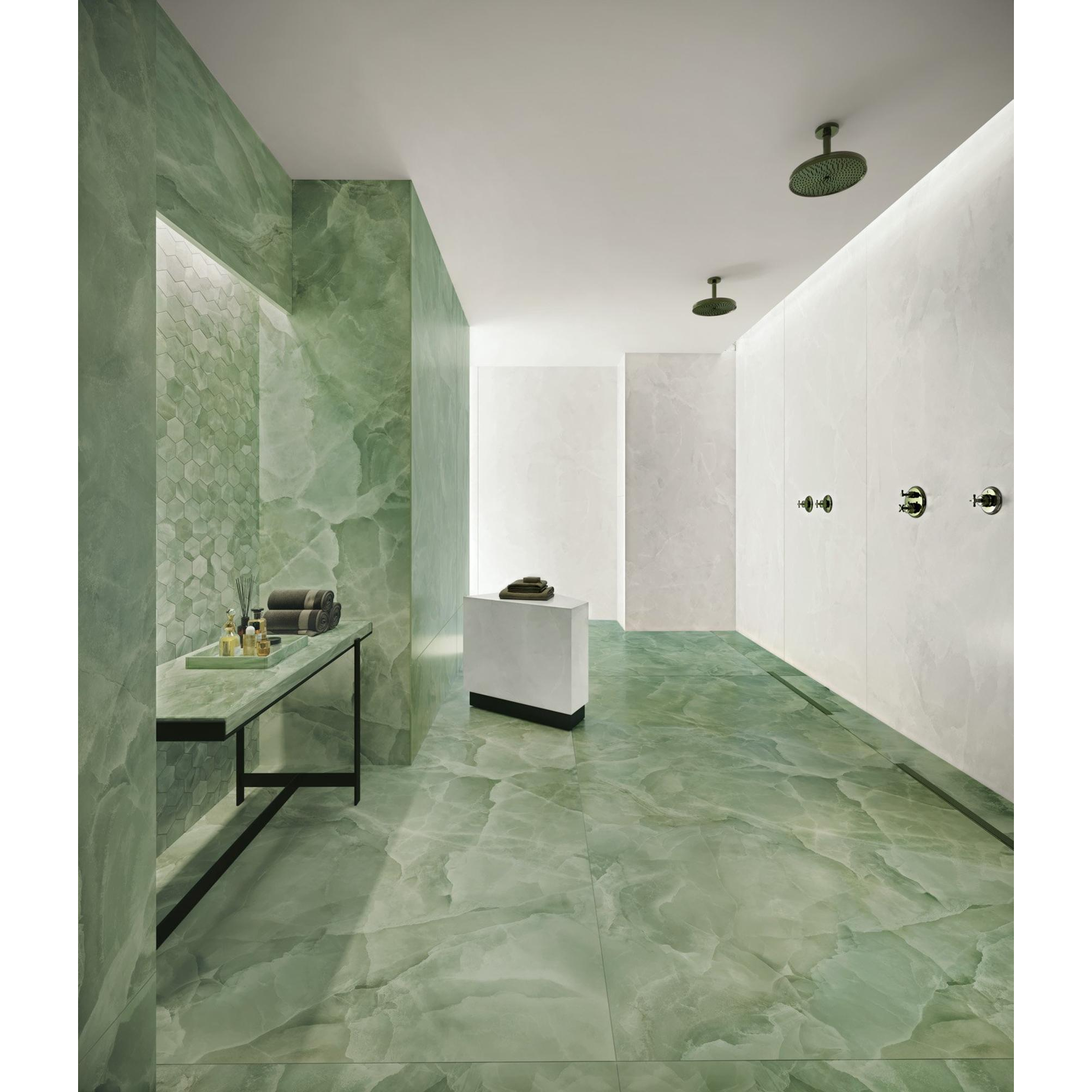 Luxueus De EnergieKer Onyx ek tegel is een toonbeeld van luxe en verfijning. Met zijn gerectificeerde afwerking straalt deze tegel een onmiskenbare klasse uit. De Jade pulido gepolijste look geeft de tegel een prachtige glans en maakt hem het stralende middelpunt van jouw badkamer. Door de grootte van 60x60cm creëert deze tegel een ruimtelijk effect en laat je badkamer groter lijken. Laat je inspireren door de weelde van deze luxueuze tegel en creëer een badkamer waar je elke dag van kunt genieten.