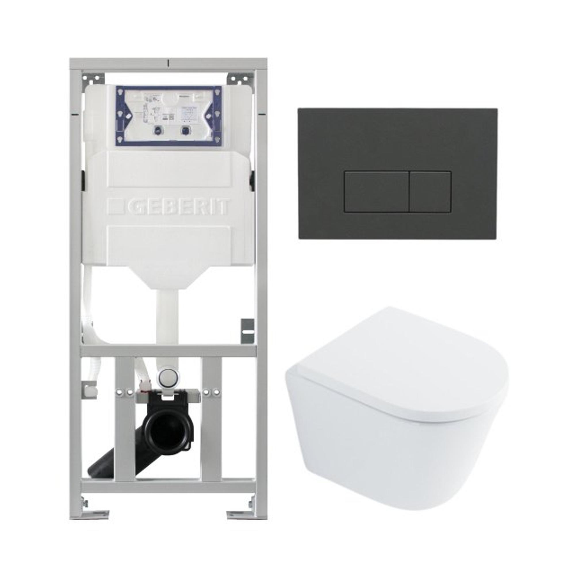 QeramiQ Dely Toiletset - 36.3x51.7cm - diepspoel - rimless - Geberit UP320 inbouwreservoir - softclose toiletzitting - antraciet mat bedieningsplaat - rechtehoekige knoppen - wit glans