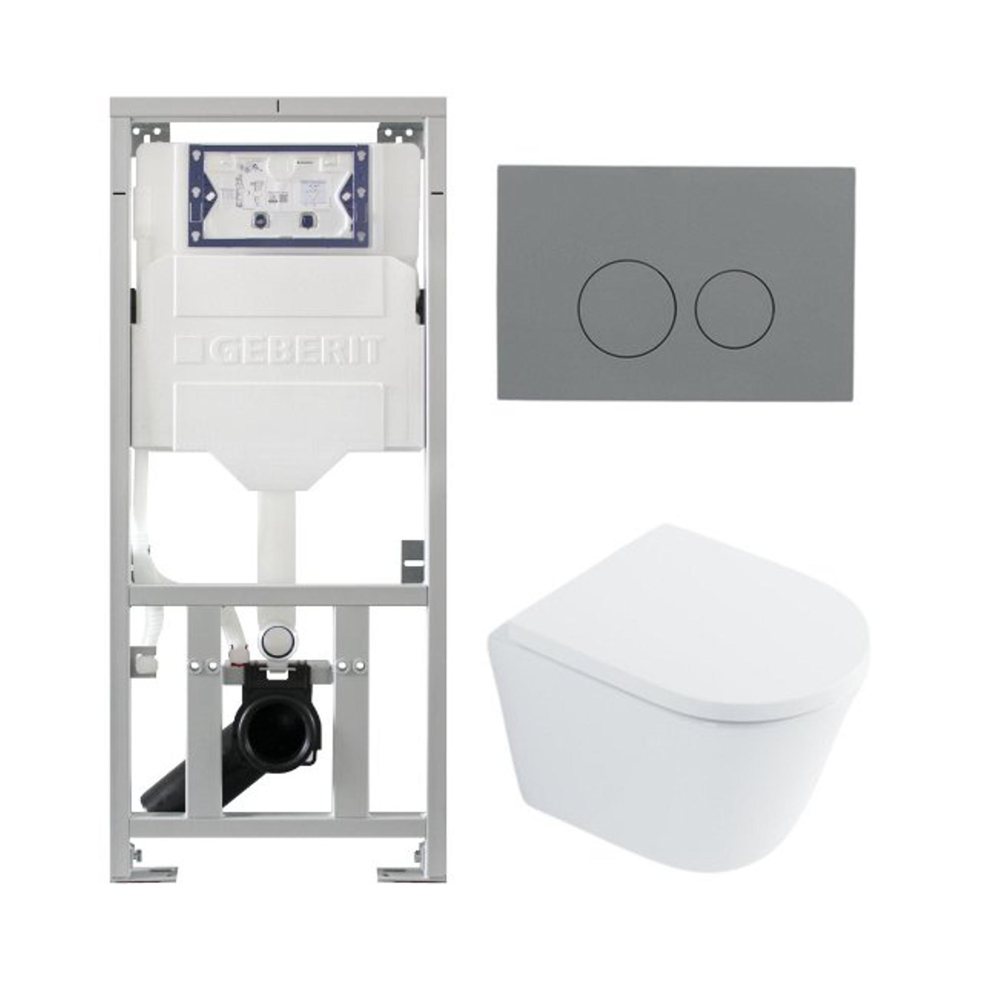QeramiQ Dely Toiletset - 36.3x51.7cm - diepspoel - rimless - Geberit UP320 inbouwreservoir - softclose toiletzitting - licht grijze bedieningsplaat - ronde knoppen - wit glans