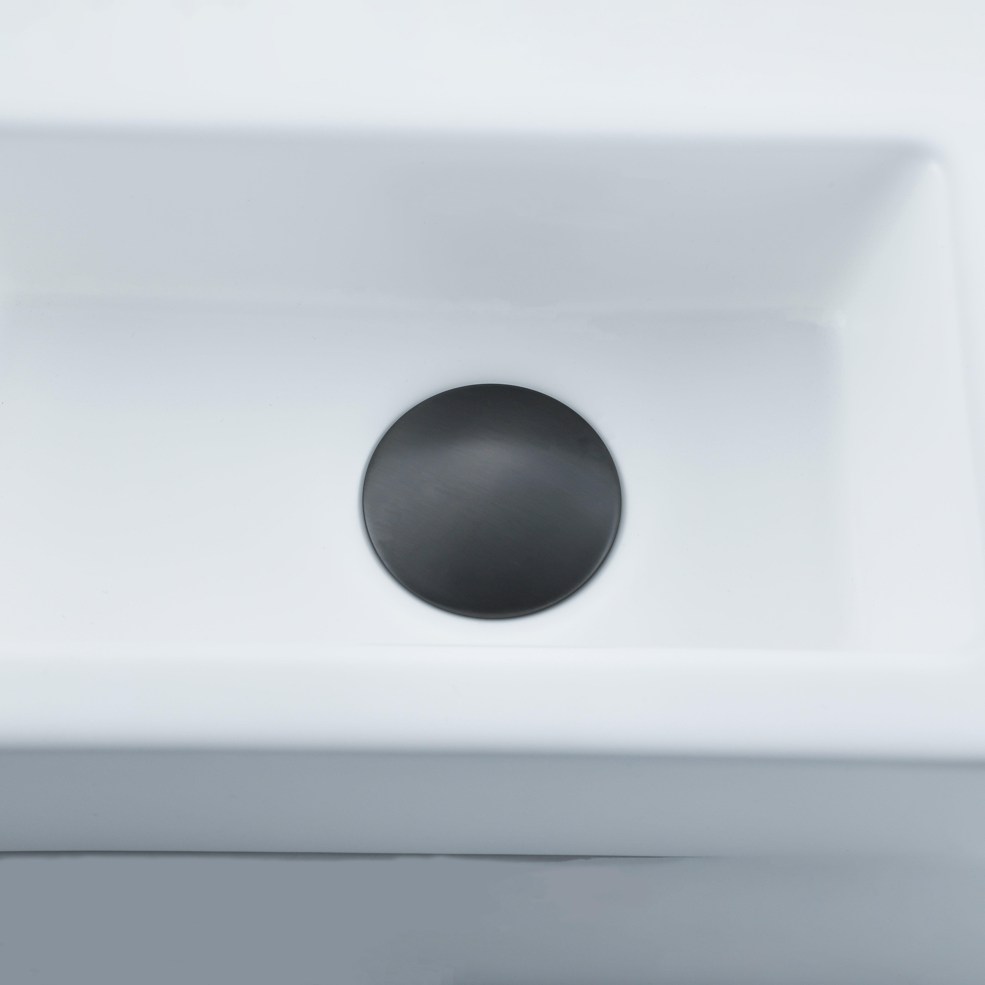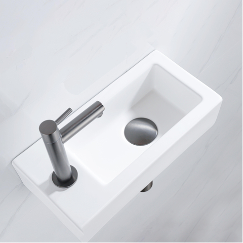 Het moderne design van de QeramiQ Fuente Fonteinset wordt benadrukt door het kraangat aan de linkerkant en de fonteinkraan in gunmetal afwerking. Deze eigentijdse details voegen een vleugje luxe toe aan de badkamer en zorgen voor een verfijnde uitstraling die indruk maakt.
