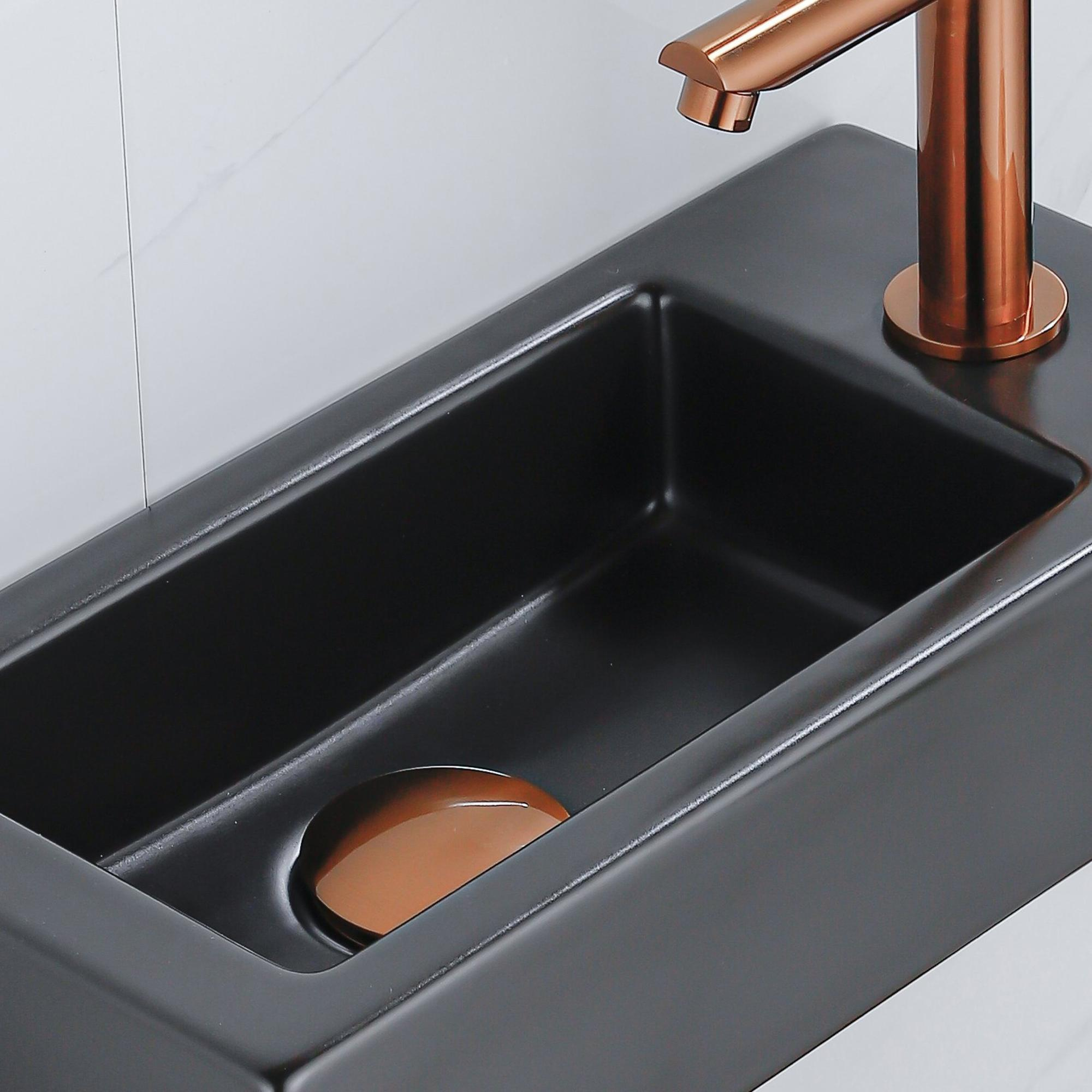QeramiQ Fuente Fonteinset - 37.5x18.5x9cm - keramiek - kraangat rechts - fonteinkraan geborsteld koper - afvoerplug - verlaagd sifon - Mat Zwart