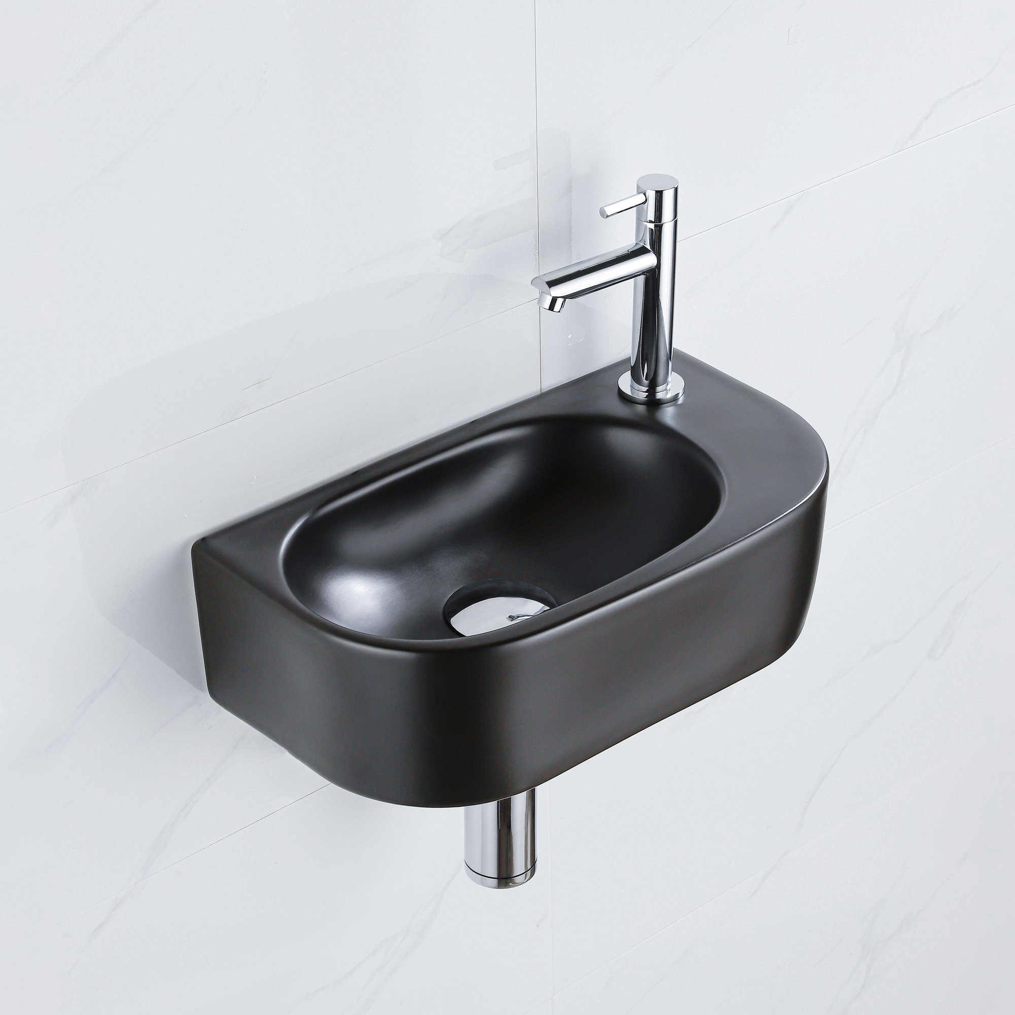 QeramiQ Fuente Fonteinset - 40x21.5x12cm - rechts - glad - halfrond - 1 kraangat - keramiek - fonteinkraan chroom - afvoerplug - verlaagd sifon - zwart mat
