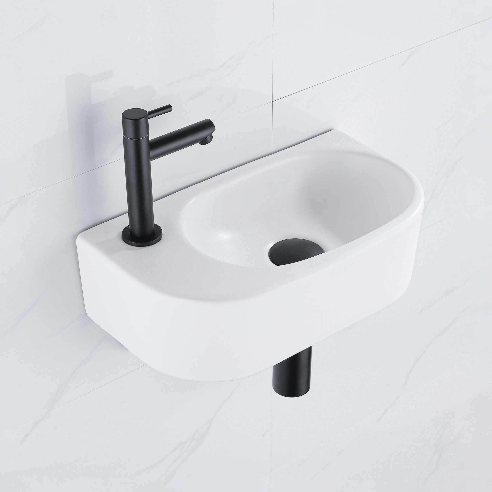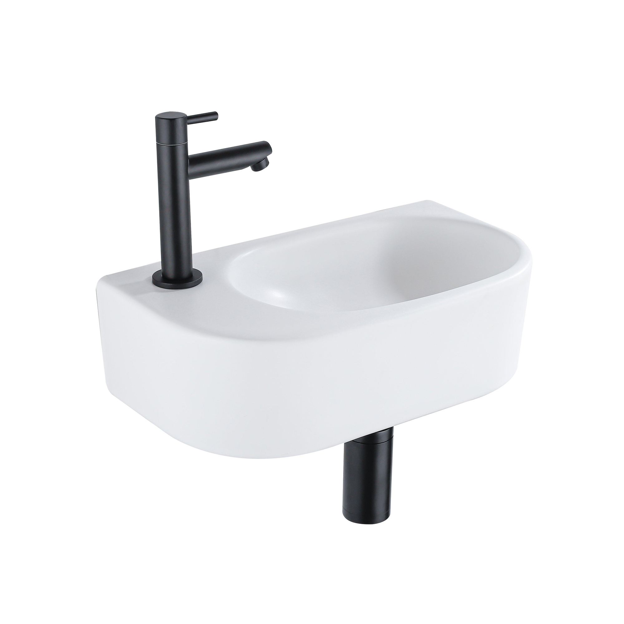QeramiQ Fuente Fonteinset - 40x21.5x12cm - links - glad - halfrond - 1 kraangat - keramiek - fonteinkraan zwart mat - afvoerplug - verlaagd sifon - wit mat