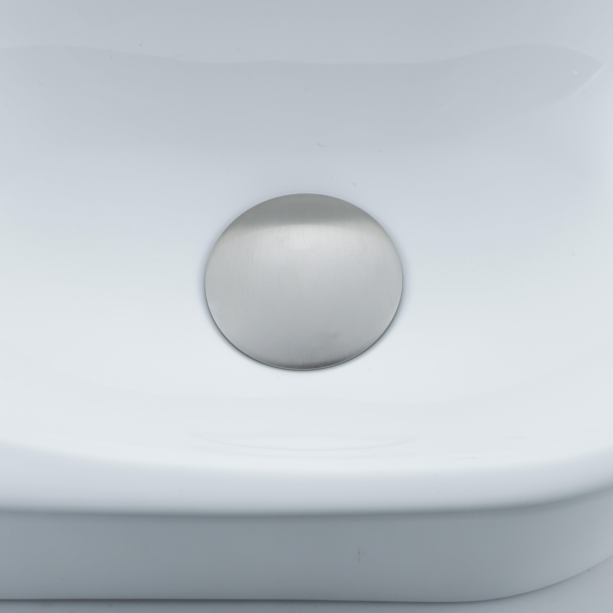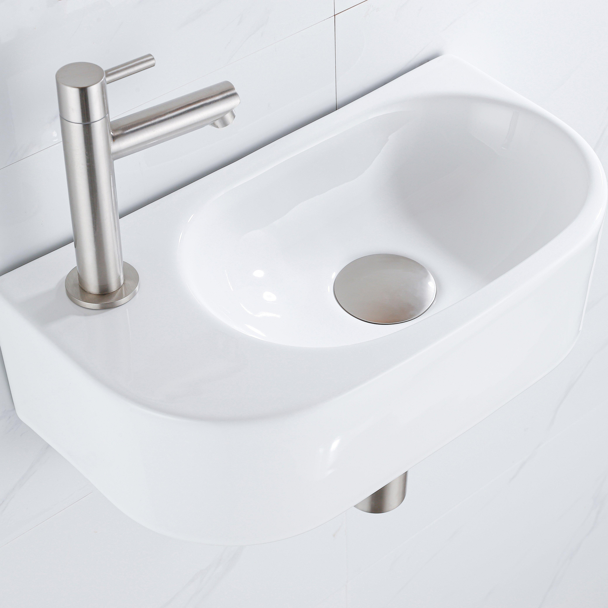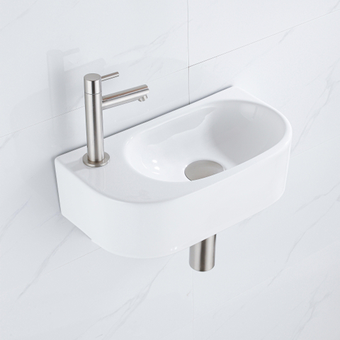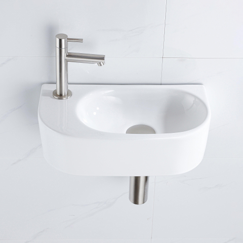 QeramiQ Fuente Fonteinset - 40x21.5x12cm - links - glad - halfrond - 1 kraangat - keramiek - fonteinkraan geborsteld rvs - afvoerplug - verlaagd sifon - wit glans