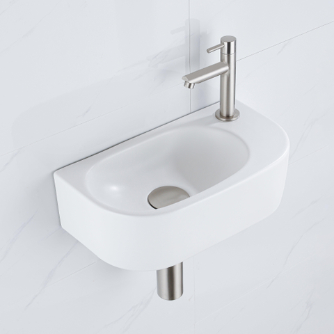 QeramiQ Fuente Fonteinset - 40x21.5x12cm - rechts - glad - halfrond - 1 kraangat - keramiek - fonteinkraan geborsteld rvs - afvoerplug - verlaagd sifon - wit mat