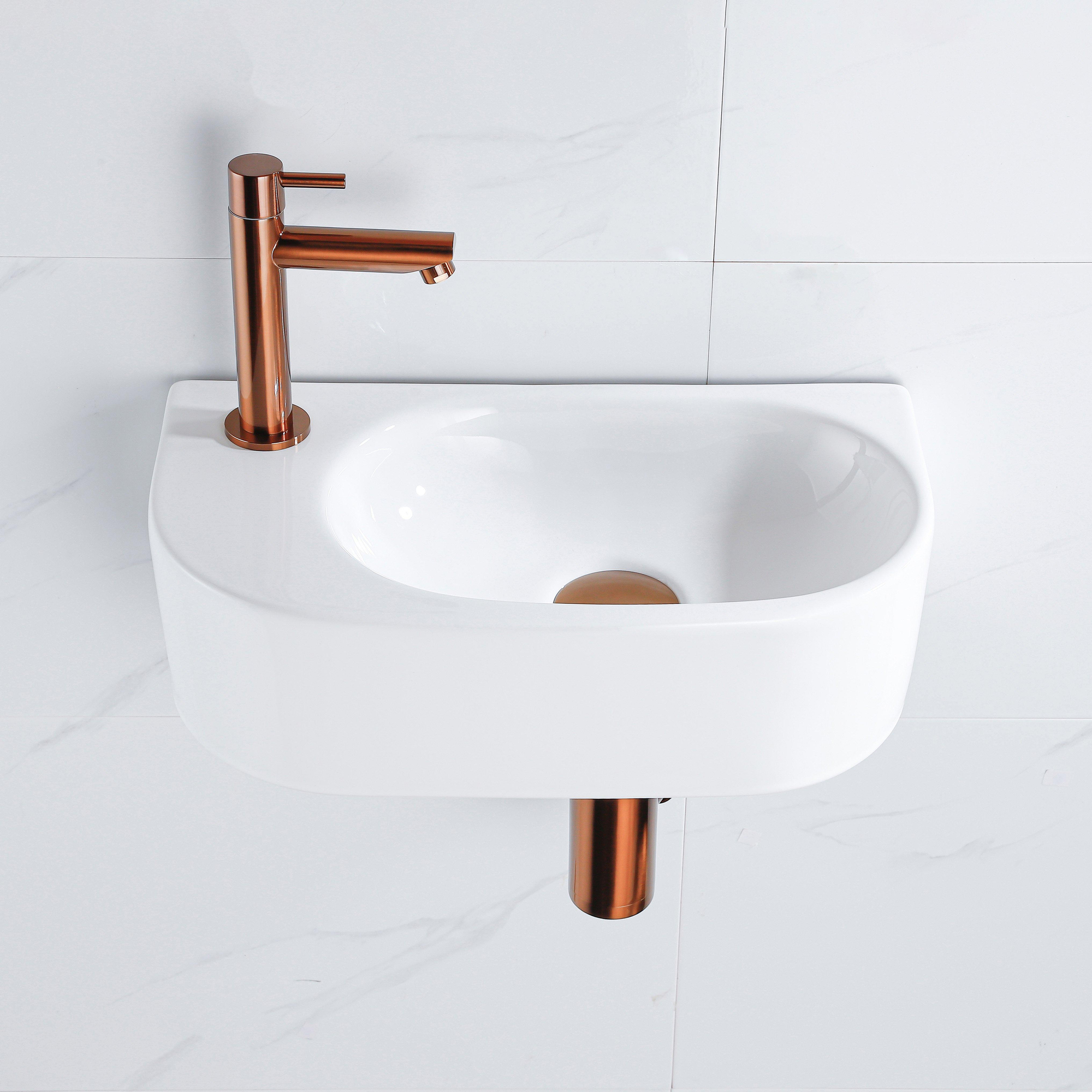 QeramiQ Fuente Fonteinset - 40x21.5x12cm - links - glad - halfrond - 1 kraangat - keramiek - fonteinkraan geborsteld koper - afvoerplug - verlaagd sifon - wit glans