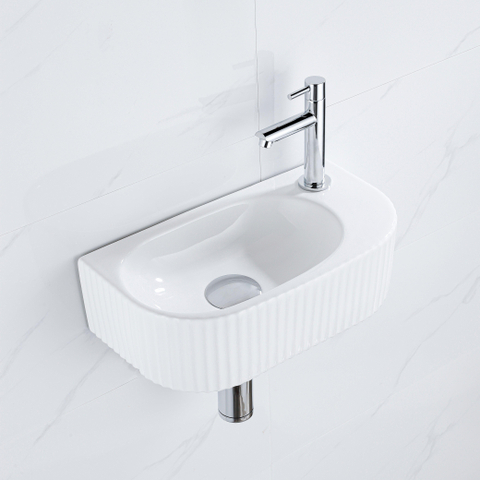 Ervaar de onmiskenbare charme van deze fonteinset, die met zijn geribbelde halfronde vorm en chique witte glans een vleugje elegantie toevoegt aan jouw badkamer. Het subtiele kraangat en de bijpassende fonteinkraan in chroom maken het geheel compleet, waardoor dit product een echte blikvanger is.