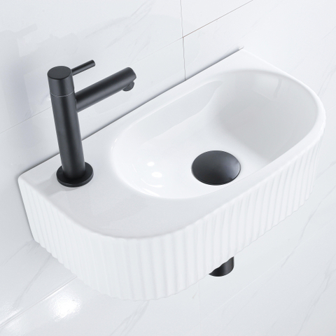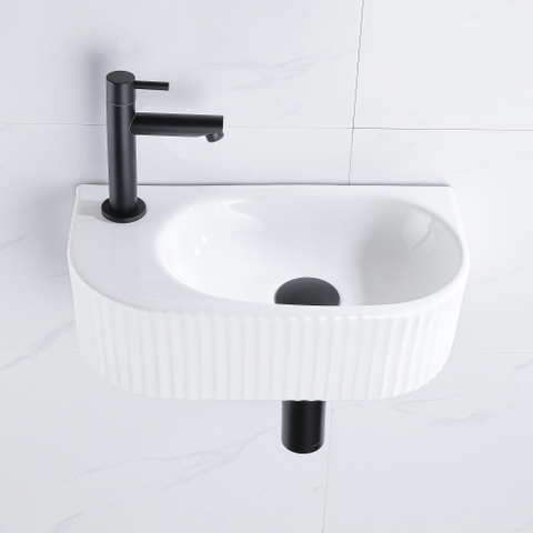 QeramiQ Fuente Fonteinset - 40x21.5x12cm - links - geribbeld - halfrond - 1 kraangat - keramiek - fonteinkraan zwart mat - afvoerplug - verlaagd sifon - wit glans