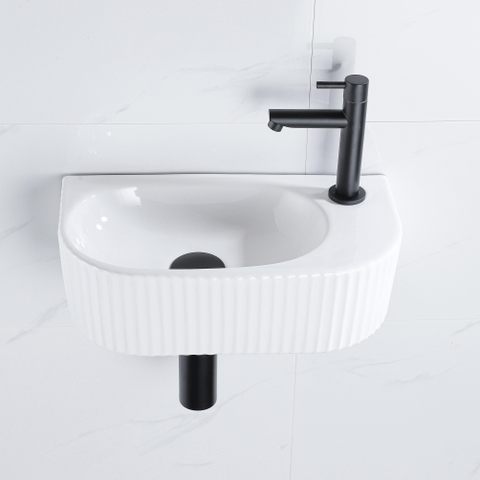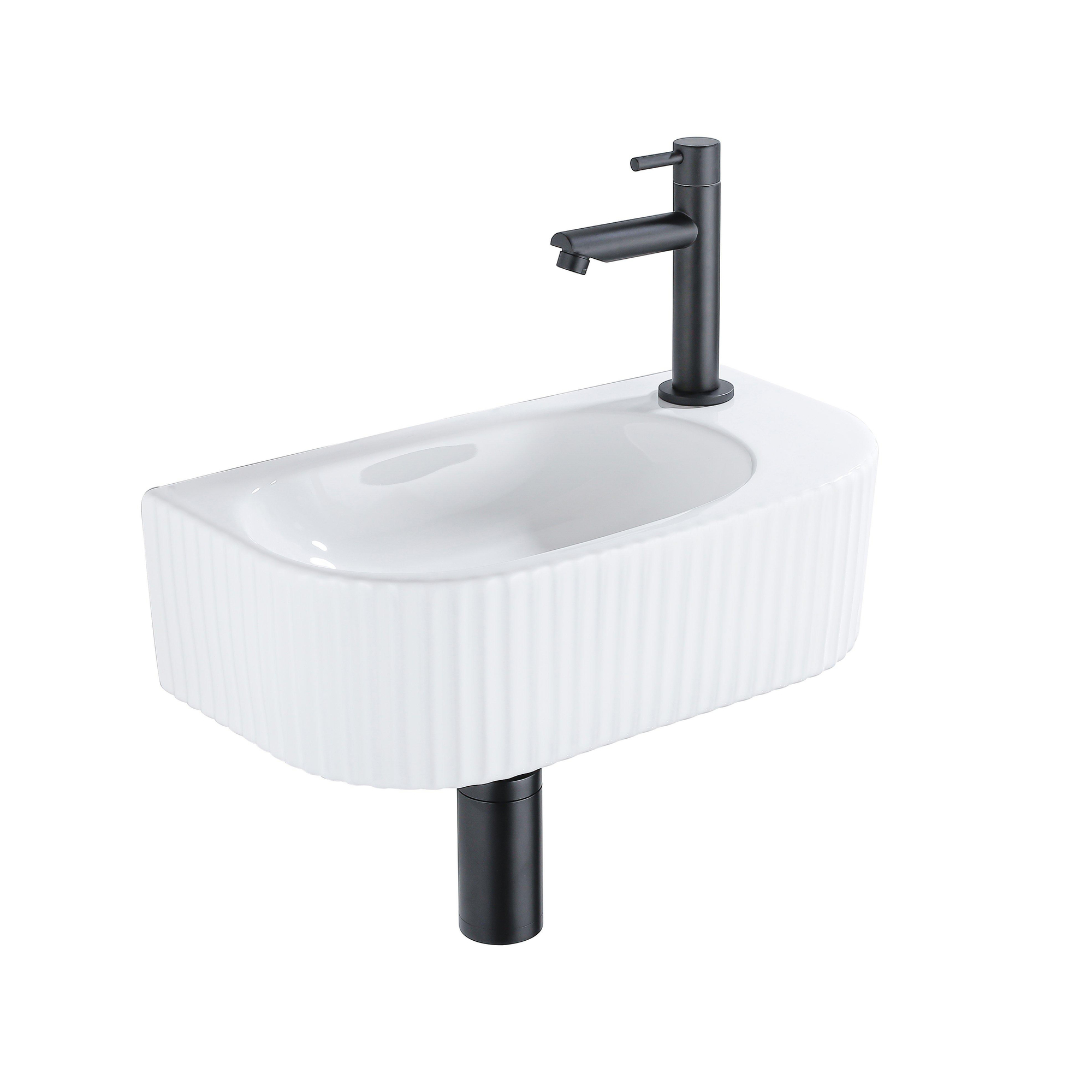 Dit fonteinset straalt een tijdloze elegantie uit met zijn geribbelde, halfronde vorm en matte zwarte fonteinkraan. De combinatie van keramiek en wit glans zorgt voor een luxueuze uitstraling die je badkamer naar een hoger niveau tilt. Het kraangat, afvoerplug en verlaagd sifon zijn zorgvuldig ontworpen voor zowel esthetiek als gebruiksgemak.