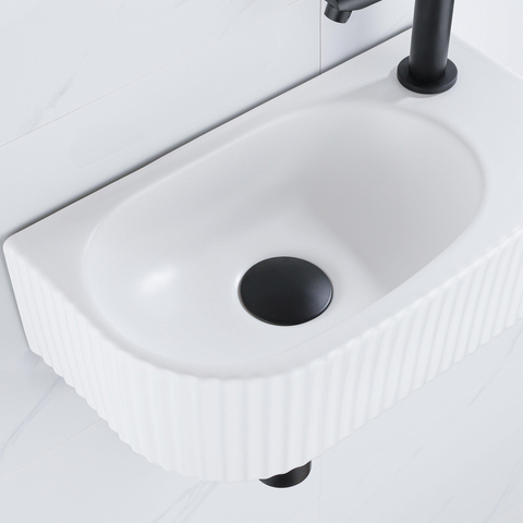 QeramiQ Fuente Fonteinset - 40x21.5x12cm - rechts - geribbeld - halfrond - 1 kraangat - keramiek - fonteinkraan zwart mat - afvoerplug - verlaagd sifon - wit mat