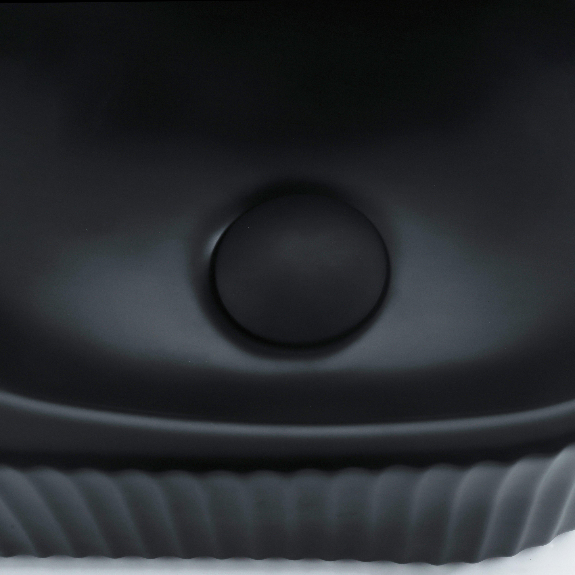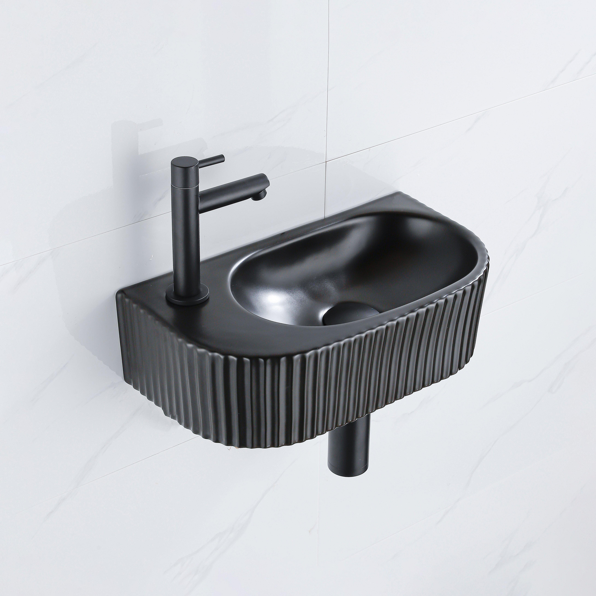 QeramiQ Fuente Fonteinset - 40x21.5x12cm - links - geribbeld - halfrond - 1 kraangat - keramiek - fonteinkraan zwart mat - afvoerplug - verlaagd sifon - zwart mat
