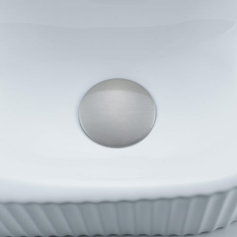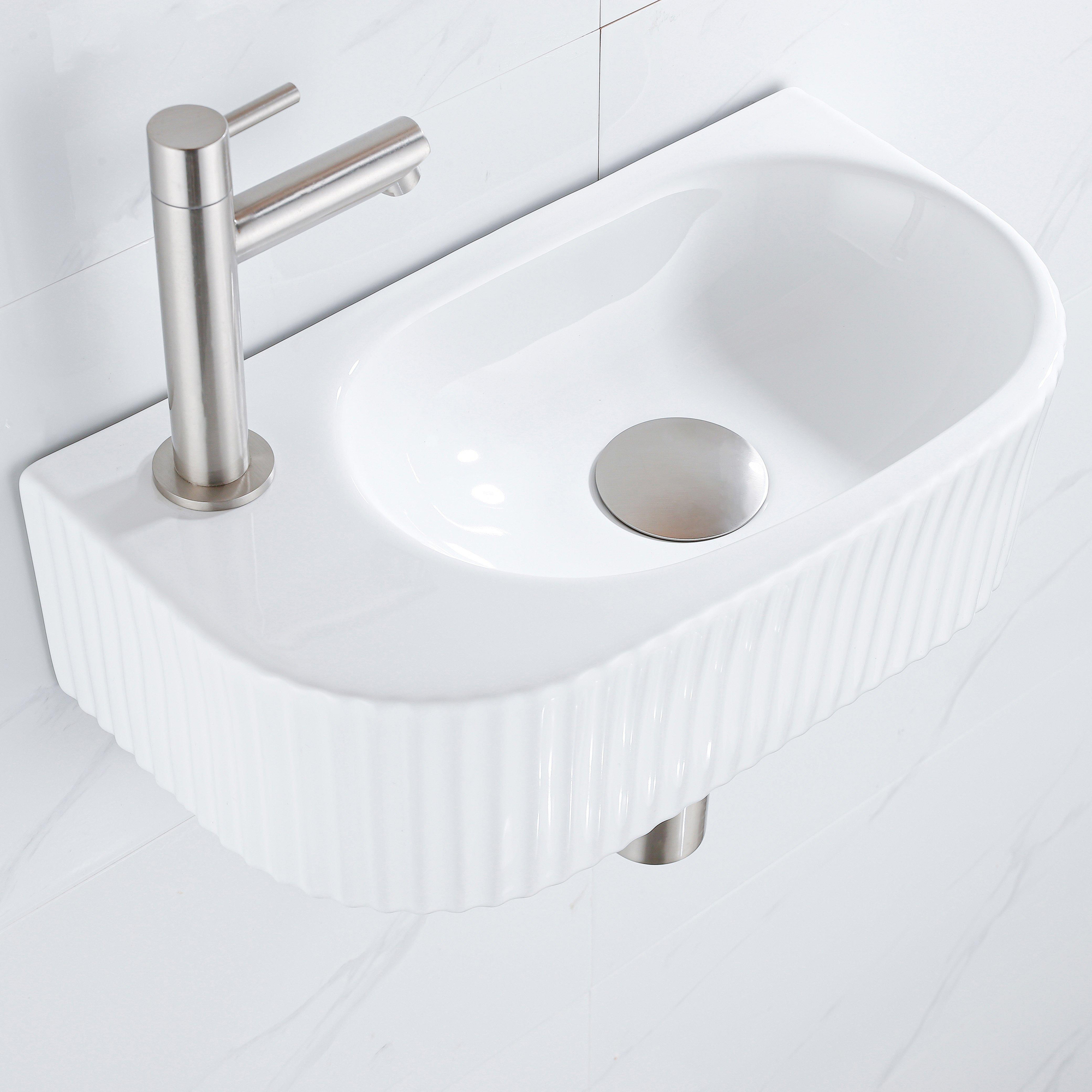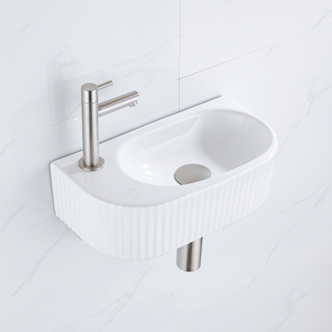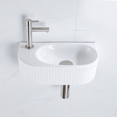 Met zijn geribbelde halfronde ontwerp en glanzend witte afwerking is dit fonteinset een ware blikvanger in elke badkamer. De subtiele details en het minimalistische ontwerp zorgen voor een tijdloze uitstraling die moeiteloos past bij verschillende interieurstijlen.
