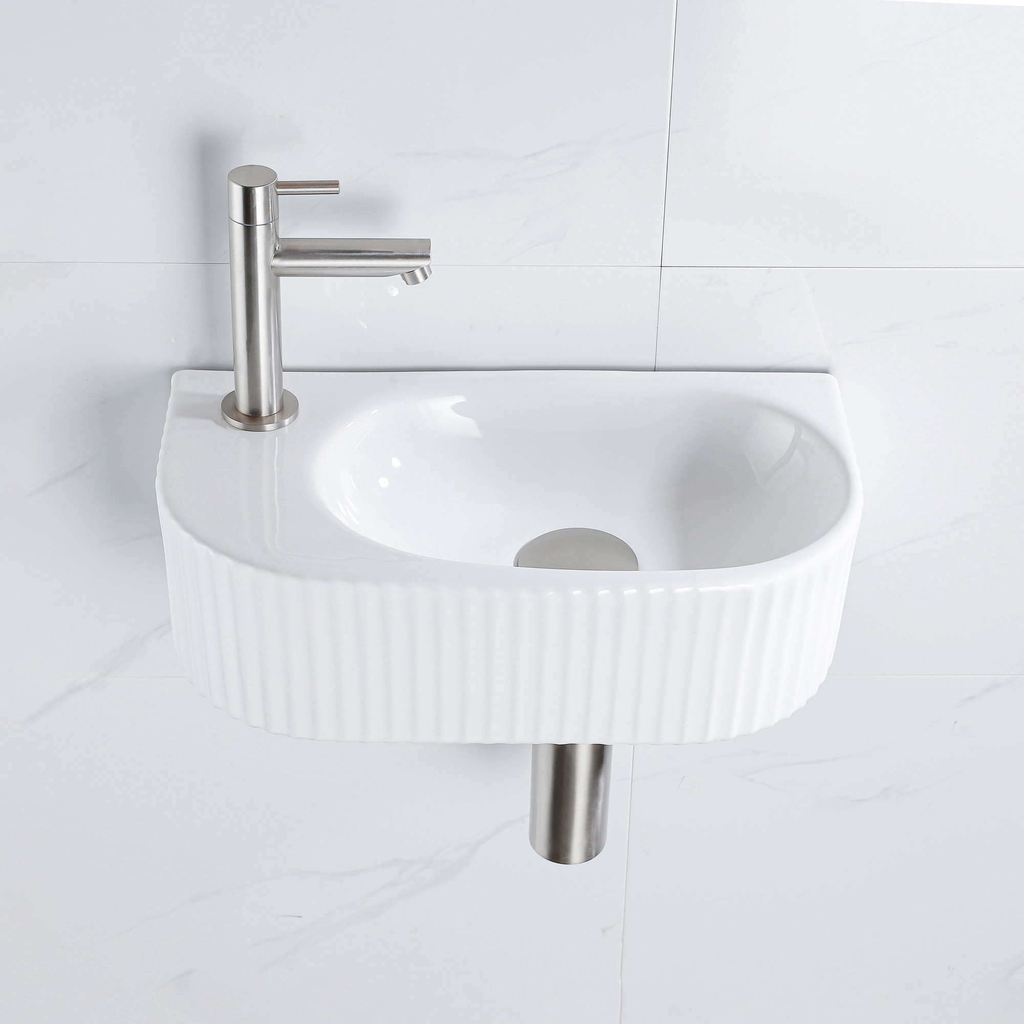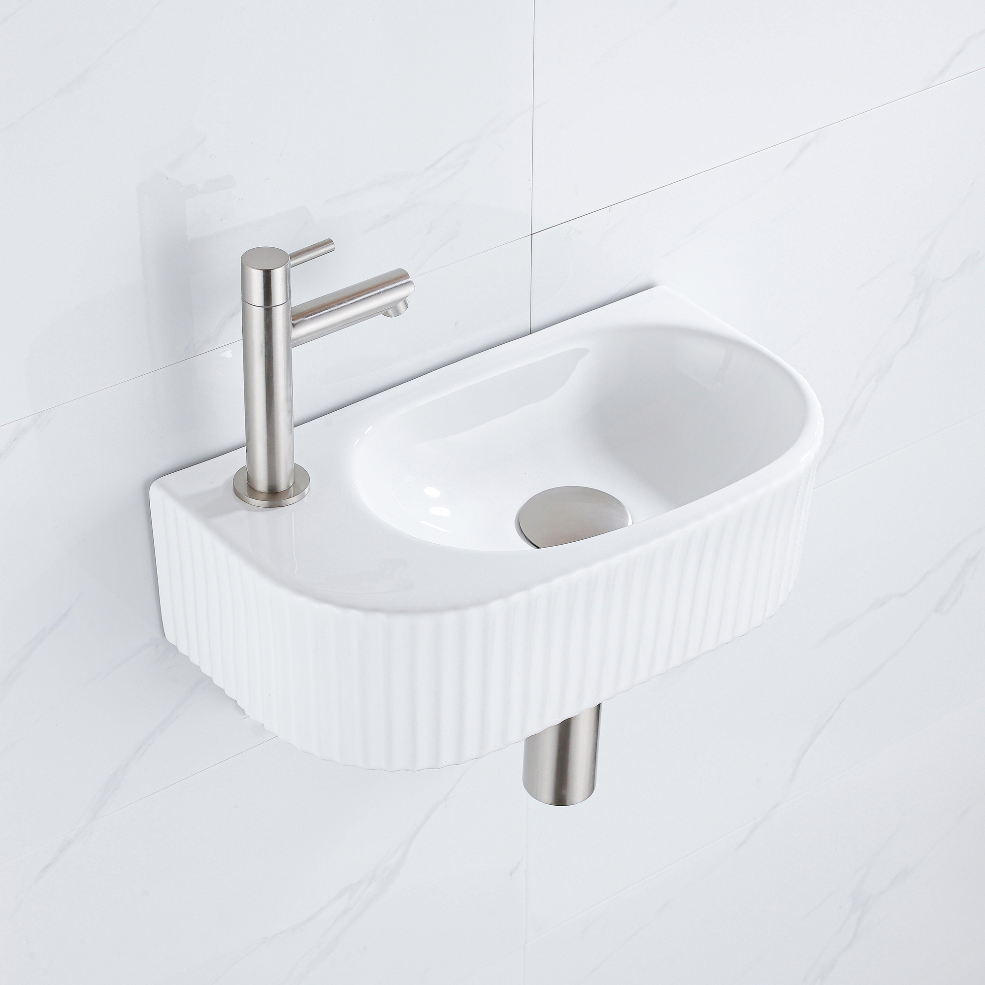 QeramiQ Fuente Fonteinset - 40x21.5x12cm - links - geribbeld - halfrond - 1 kraangat - keramiek - fonteinkraan geborsteld rvs - afvoerplug - verlaagd sifon - wit glans
