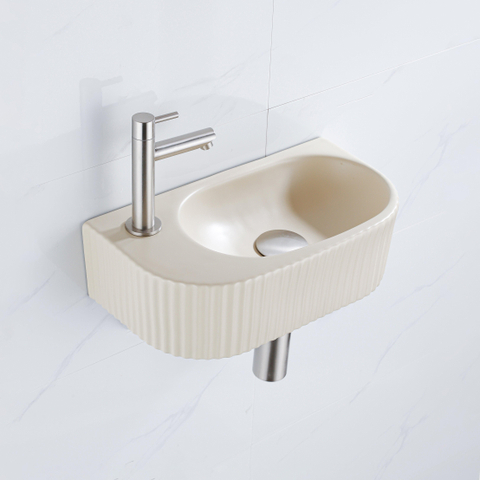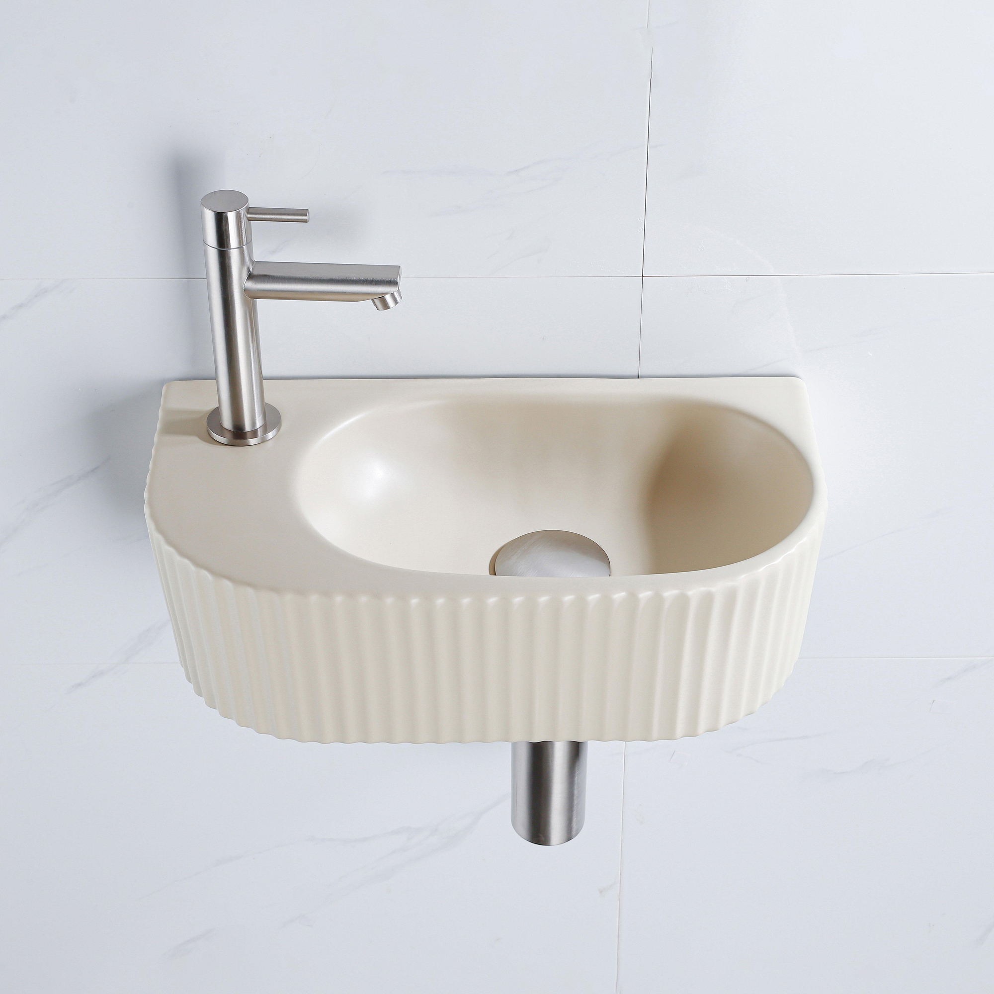 QeramiQ Fuente Fonteinset - 40x21.5x12cm - links - geribbeld - halfrond - 1 kraangat - keramiek - fonteinkraan geborsteld rvs - afvoerplug - verlaagd sifon - beige