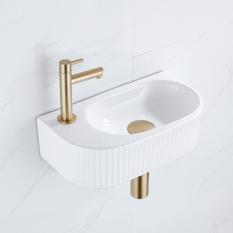 QeramiQ Fuente Fonteinset - 40x21.5x12cm - links - geribbeld - halfrond - 1 kraangat - keramiek - fonteinkraan geborsteld messing - afvoerplug - verlaagd sifon - wit glans