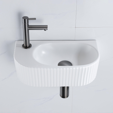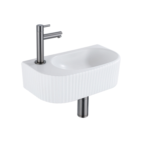 QeramiQ Fuente Fonteinset - 40x21.5x12cm - links - geribbeld - halfrond - 1 kraangat - keramiek - fonteinkraan gunmetal - afvoerplug - verlaagd sifon - wit mat