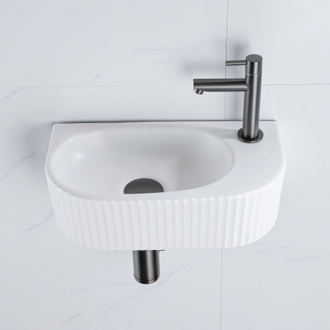 QeramiQ Fuente Fonteinset - 40x21.5x12cm - rechts - geribbeld - halfrond - 1 kraangat - keramiek - fonteinkraan gunmetal - afvoerplug - verlaagd sifon - wit mat