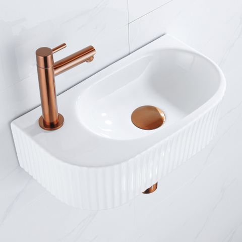 QeramiQ Fuente Fonteinset - 40x21.5x12cm - links - geribbeld - halfrond - 1 kraangat - keramiek - fonteinkraan geborsteld koper - afvoerplug - verlaagd sifon - wit glans