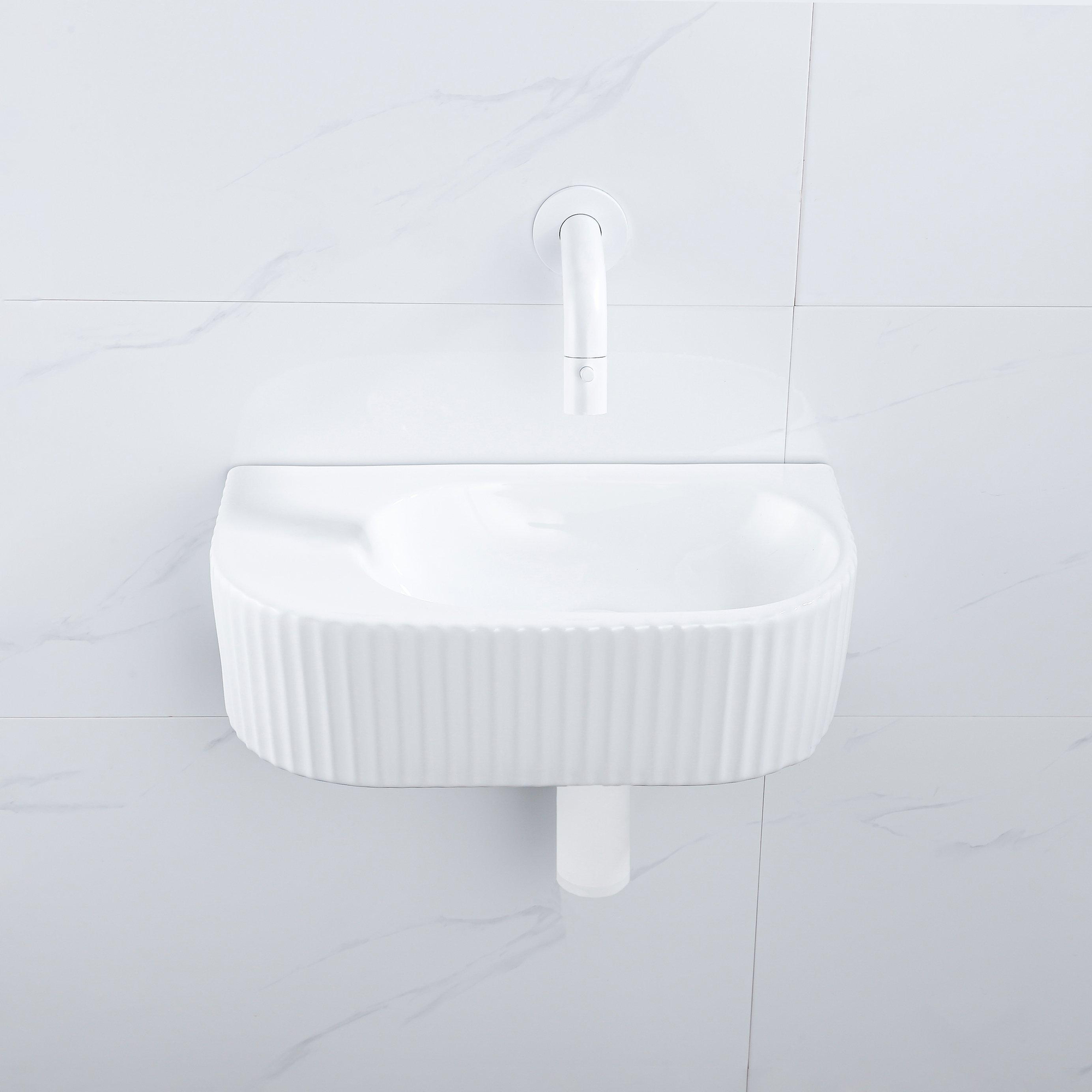 Kleur fontein: Wit mat - Structuur fontein: Geribbeld - Plaats wasbak: Rechts - Kleur kraan: Wit mat (€ 169,99 )