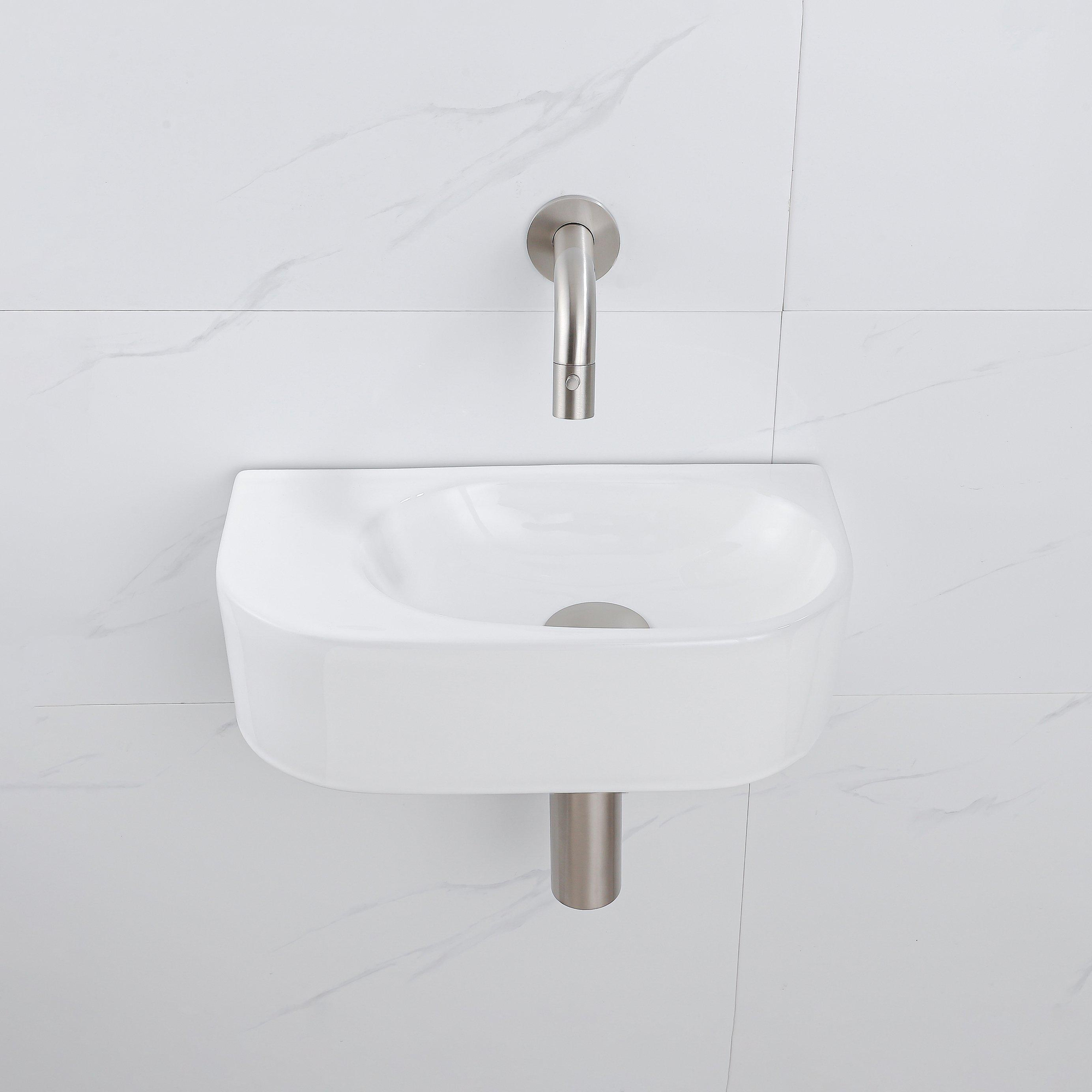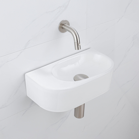 QeramiQ Fuente Fonteinset - 40x21.5x12cm - glad - halfrond - keramiek - fonteinkraan geborsteld rvs - afvoerplug - verlaagd sifon - wit glans