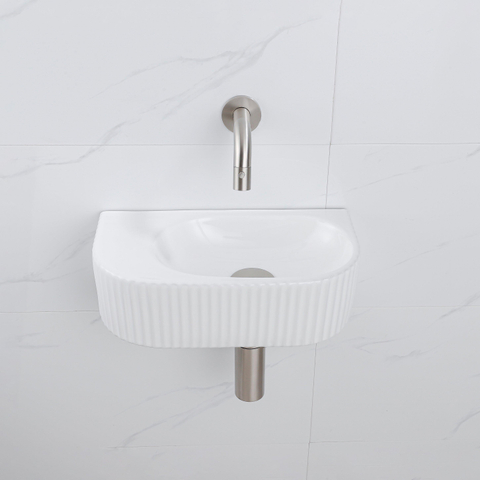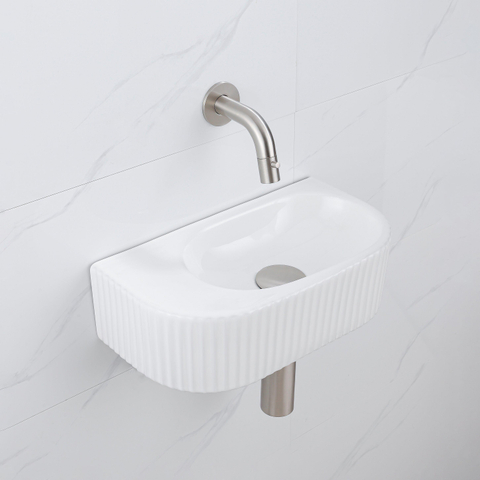 Ervaar de unieke textuur van dit fonteinset met zijn geribbelde oppervlak dat niet alleen visueel aantrekkelijk is, maar ook zorgt voor een subtiele tactiele sensatie. De geribbelde afwerking voegt een speels element toe aan de strakke lijnen van het halfronde ontwerp, waardoor dit fonteinset een echte blikvanger wordt in je badkamer.
