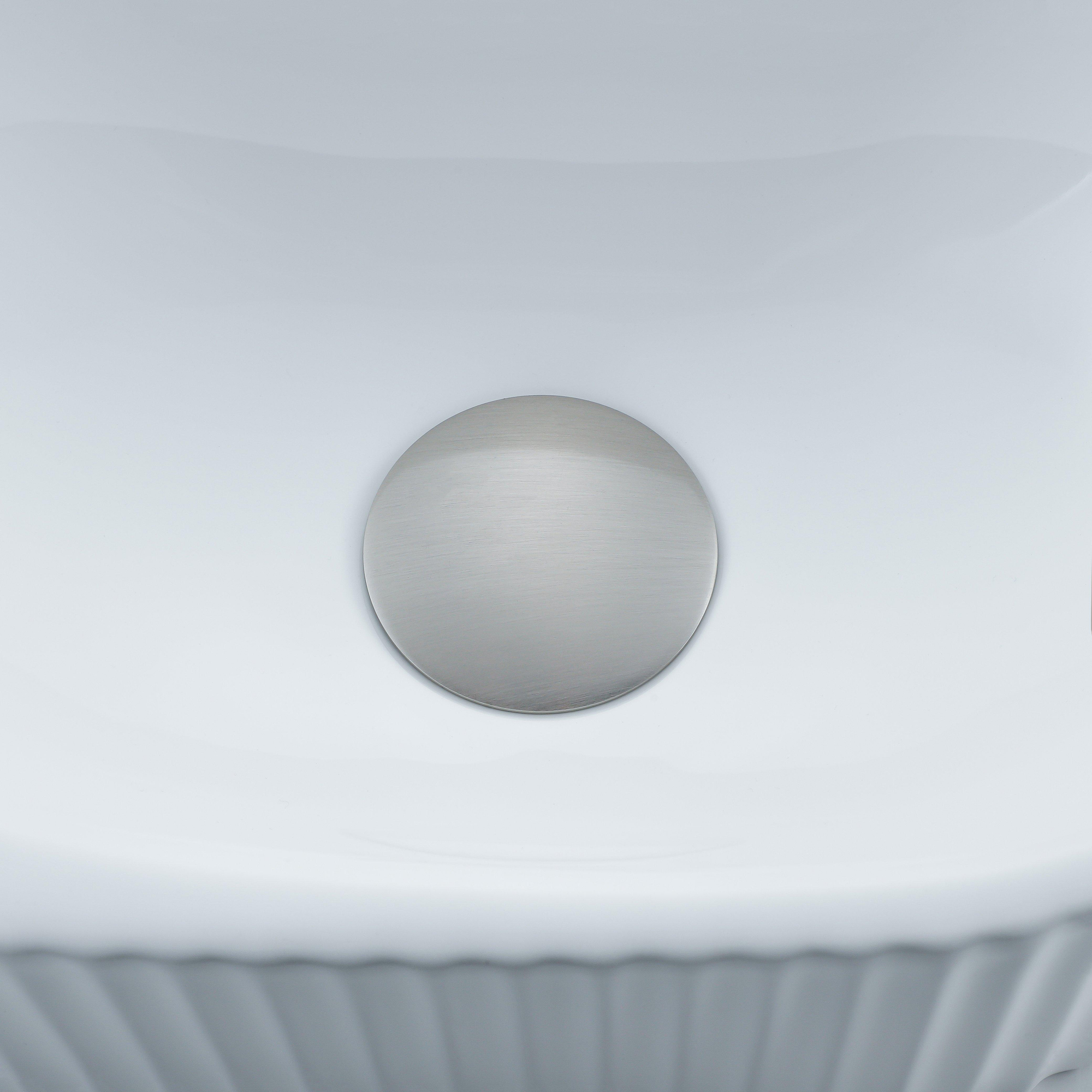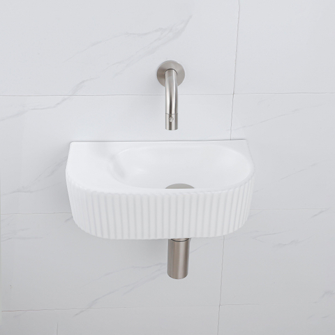 QeramiQ Fuente Fonteinset - 40x21.5x12cm - geribbeld - halfrond - keramiek - fonteinkraan geborsteld rvs - afvoerplug - verlaagd sifon - wit mat