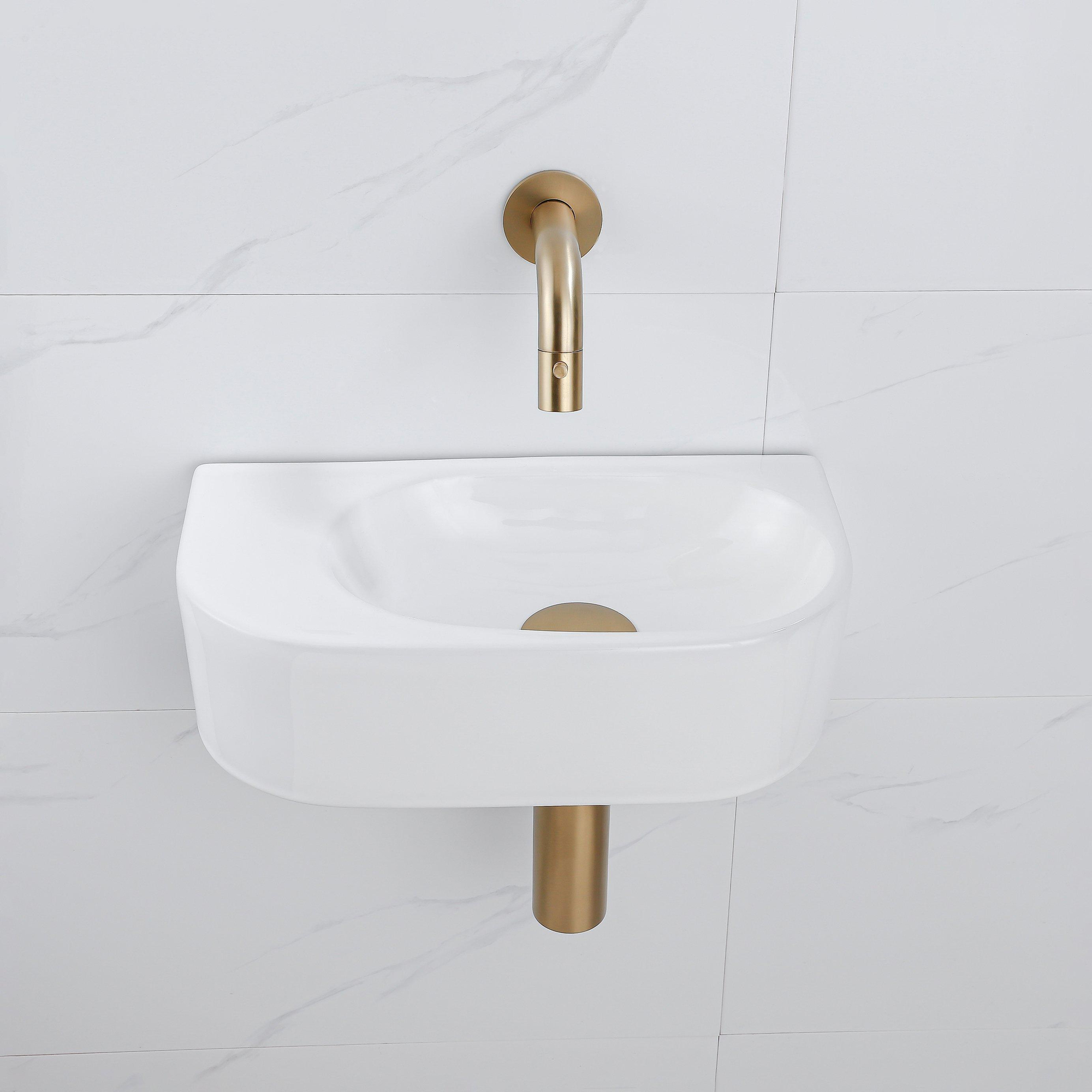 QeramiQ Fuente Fonteinset - 40x21.5x12cm - glad - halfrond - keramiek - fonteinkraan geborsteld messing - afvoerplug - verlaagd sifon - wit glans