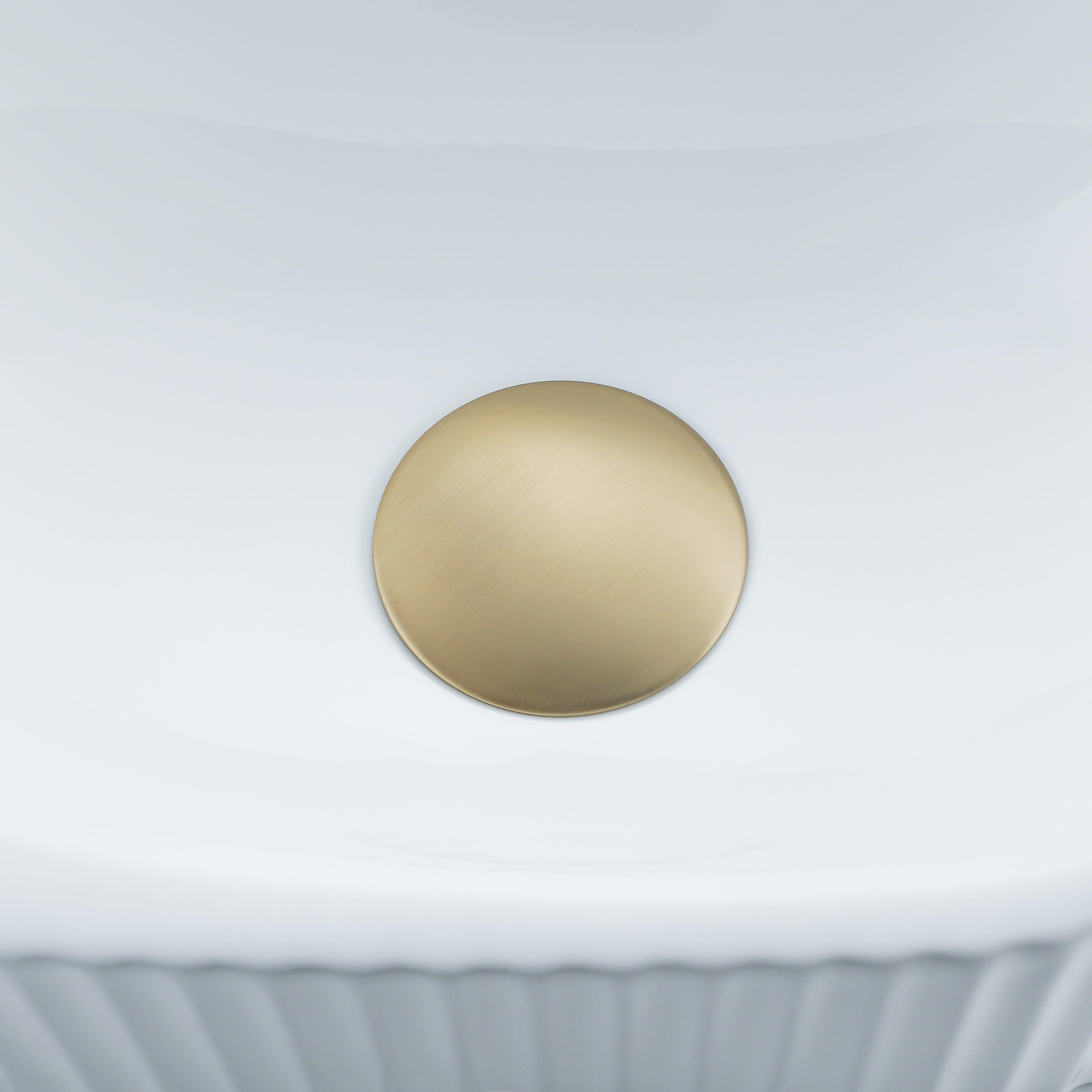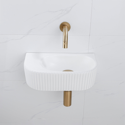 QeramiQ Fuente Fonteinset - 40x21.5x12cm - geribbeld - halfrond - keramiek - fonteinkraan geborsteld messing - afvoerplug - verlaagd sifon - wit mat