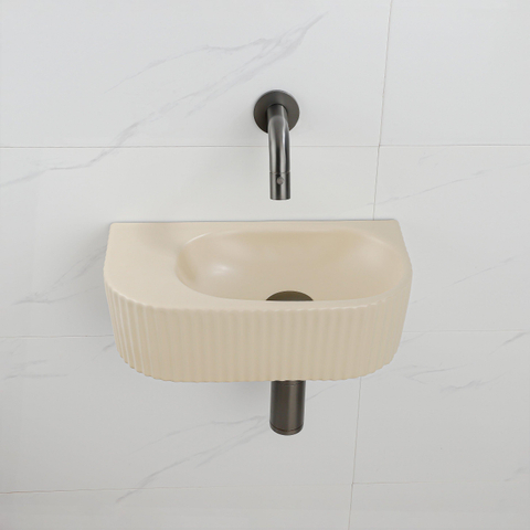 QeramiQ Fuente Fonteinset - 40x21.5x12cm - geribbeld - halfrond - zonder kraangat - keramiek - fonteinkraan gunmetal - afvoerplug - verlaagd sifon - beige
