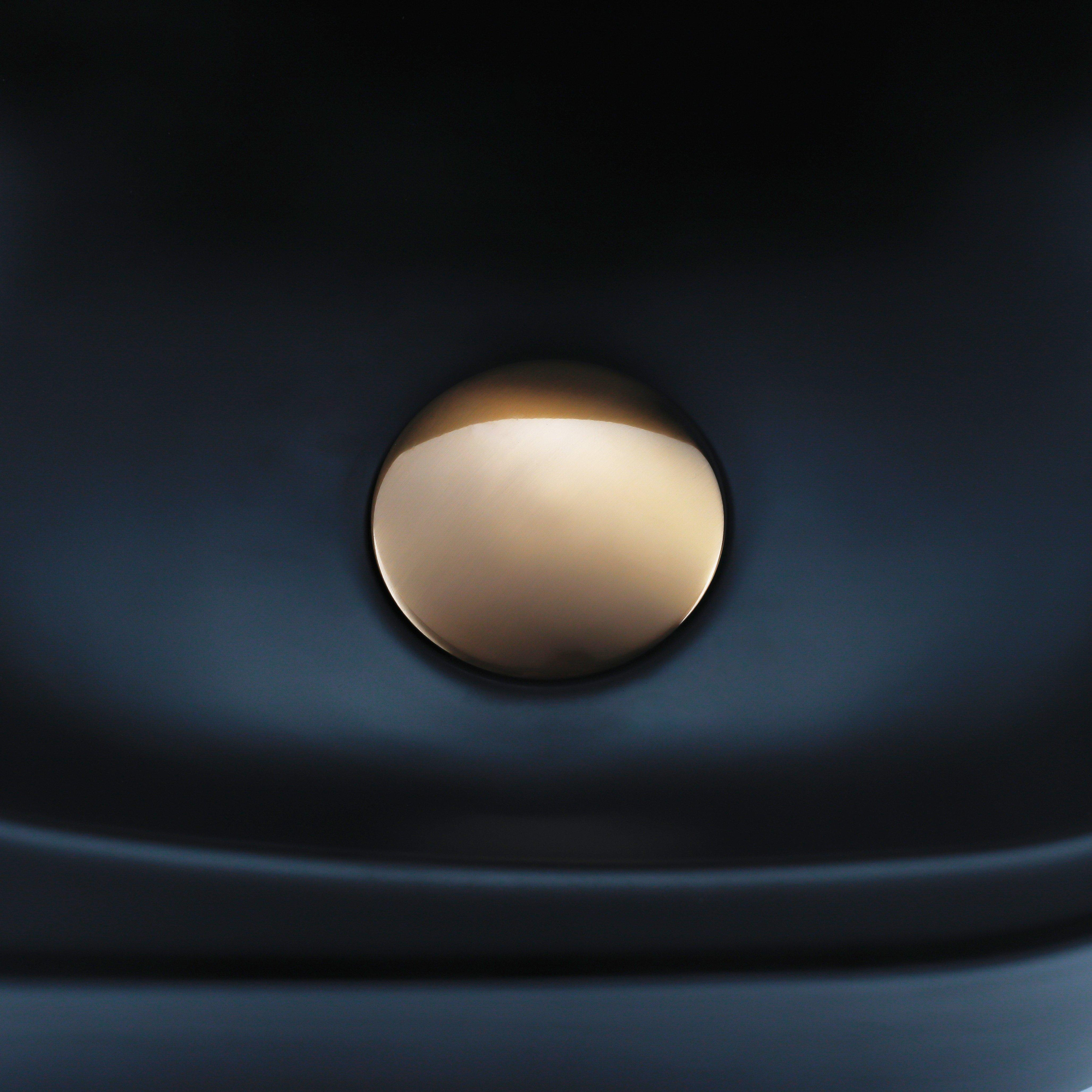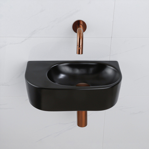QeramiQ Fuente Fonteinset - 40x21.5x12cm - glad - halfrond - keramiek - fonteinkraan geborsteld koper - afvoerplug - verlaagd sifon - zwart mat