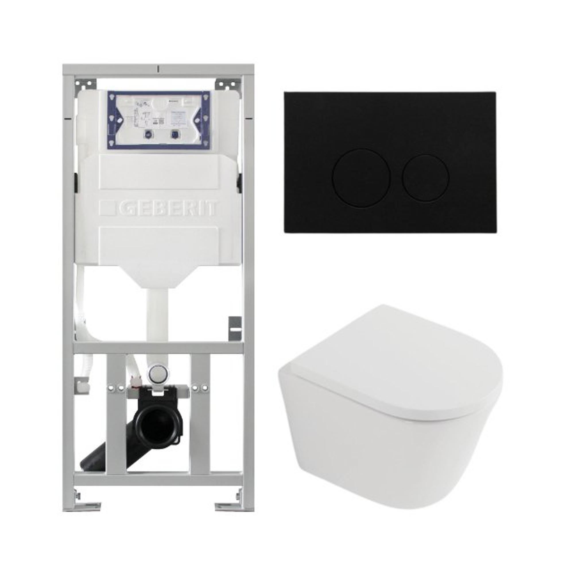 QeramiQ Dely Toiletset - 36.3x51.7cm - diepspoel - rimless - Geberit UP320 inbouwreservoir - softclose toilet zitting 35 mm - kunststof mat zwarte bedieningsplaat - ronde knoppen - mat wit