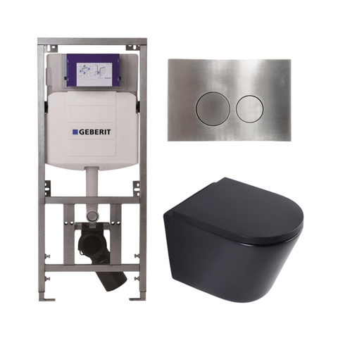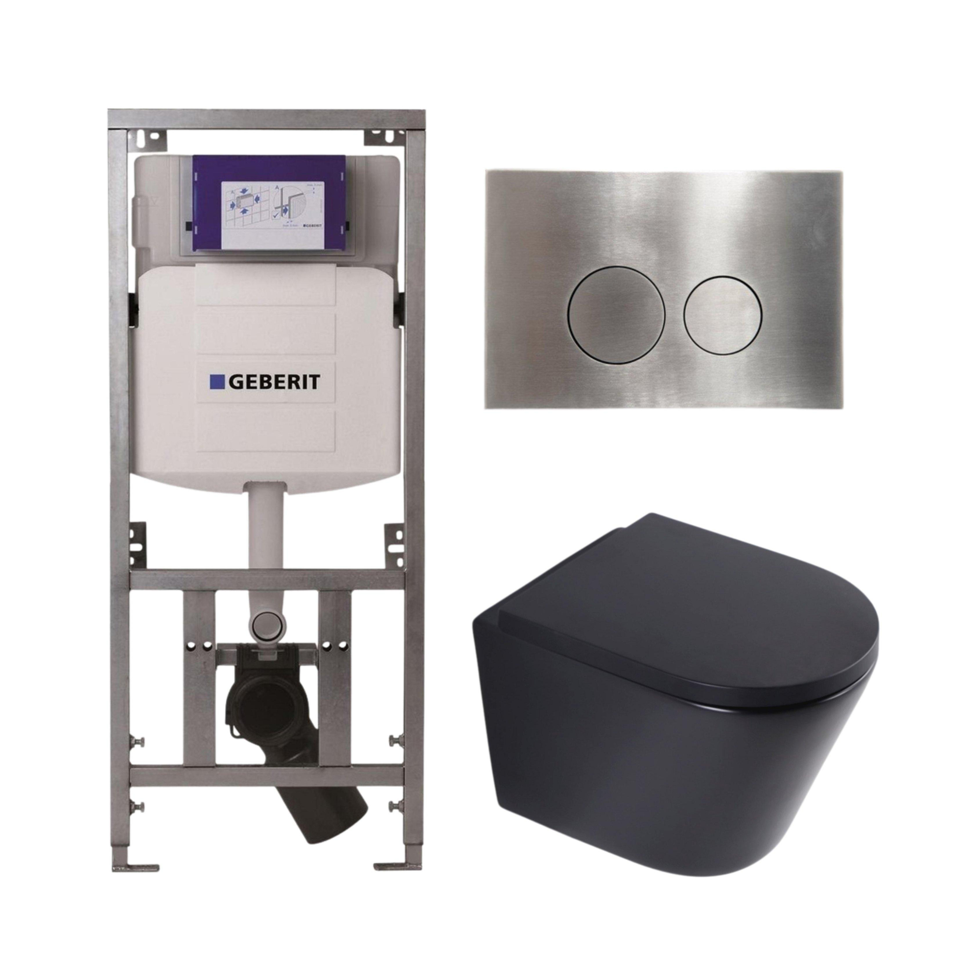 QeramiQ Dely Toiletset - 36.3x51.7cm - diepspoel - rimless - Geberit UP320 inbouwreservoir - softclose toilet zitting 35 mm - steel bedieningsplaat - ronde knoppen - mat zwart