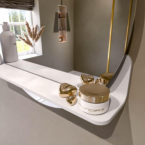 Het planchet, met zijn vloeiend afgeronde hoeken, biedt handige opbergruimte voor uw dagelijkse benodigdheden. De spiegel is subtiel verzonken in het planchet, wat zorgt voor een moderne en stijlvolle uitstraling.
