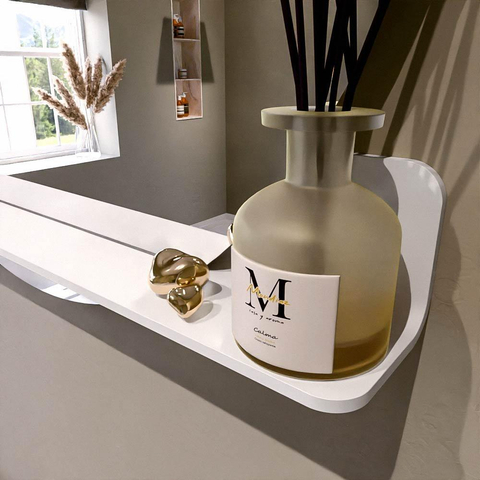Beschikbaar in 17 effen kleuren die perfect passen bij elke inrichting. Solid Surface is krasbestendig, onderhoudsvriendelijk en garandeert een langdurige, luxueuze afwerking. Deze spiegel biedt de ideale combinatie van functionaliteit en design!