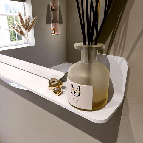 Beschikbaar in 17 effen kleuren die perfect passen bij elke inrichting. Solid Surface is krasbestendig, onderhoudsvriendelijk en garandeert een langdurige, luxueuze afwerking. Deze spiegel biedt de ideale combinatie van functionaliteit en design!