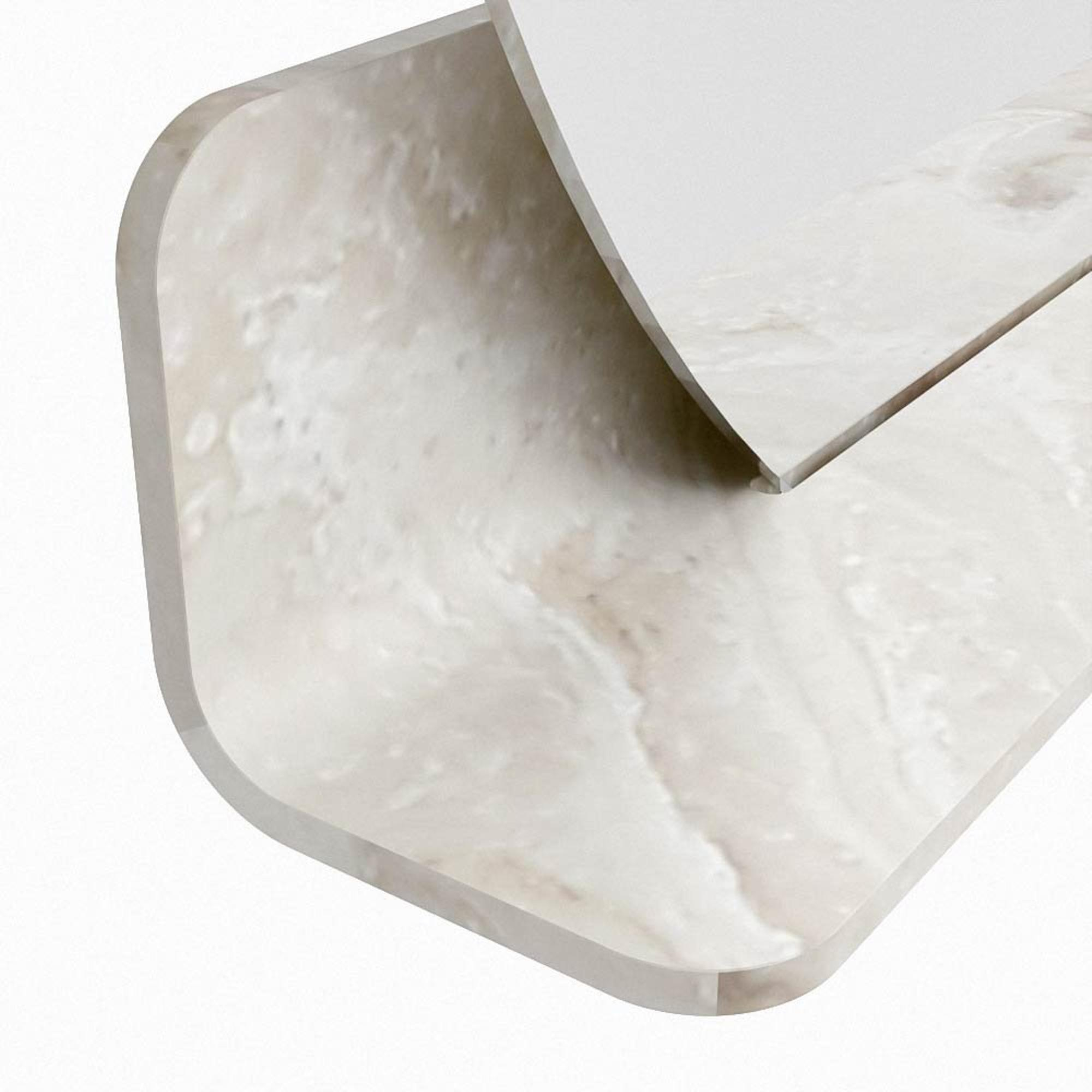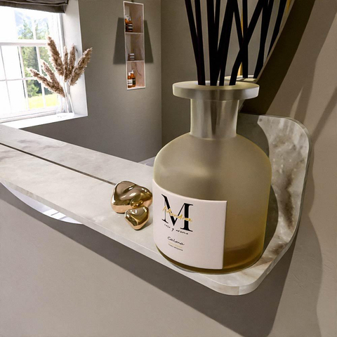 Het planchet, met zijn vloeiend afgeronde hoeken, biedt handige opbergruimte voor uw dagelijkse benodigdheden. De spiegel is subtiel verzonken in het planchet, wat zorgt voor een moderne en stijlvolle uitstraling.