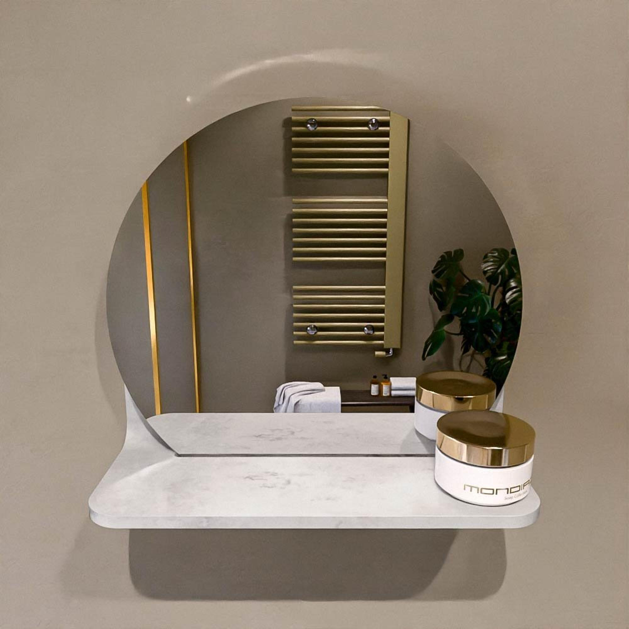 Geef uw ruimte een elegante en praktische Touch met deze ronde spiegel, waarbij de spiegel prachtig is verwerkt in een verfijnd planchet van Corian Solid Surface. Het design is niet alleen functioneel, maar ook een stijlvolle toevoeging aan moderne interieurs, ideaal te combineren met onze de DLUX-serie, zoals de ALAN, de VICA en de TURE DLUX.