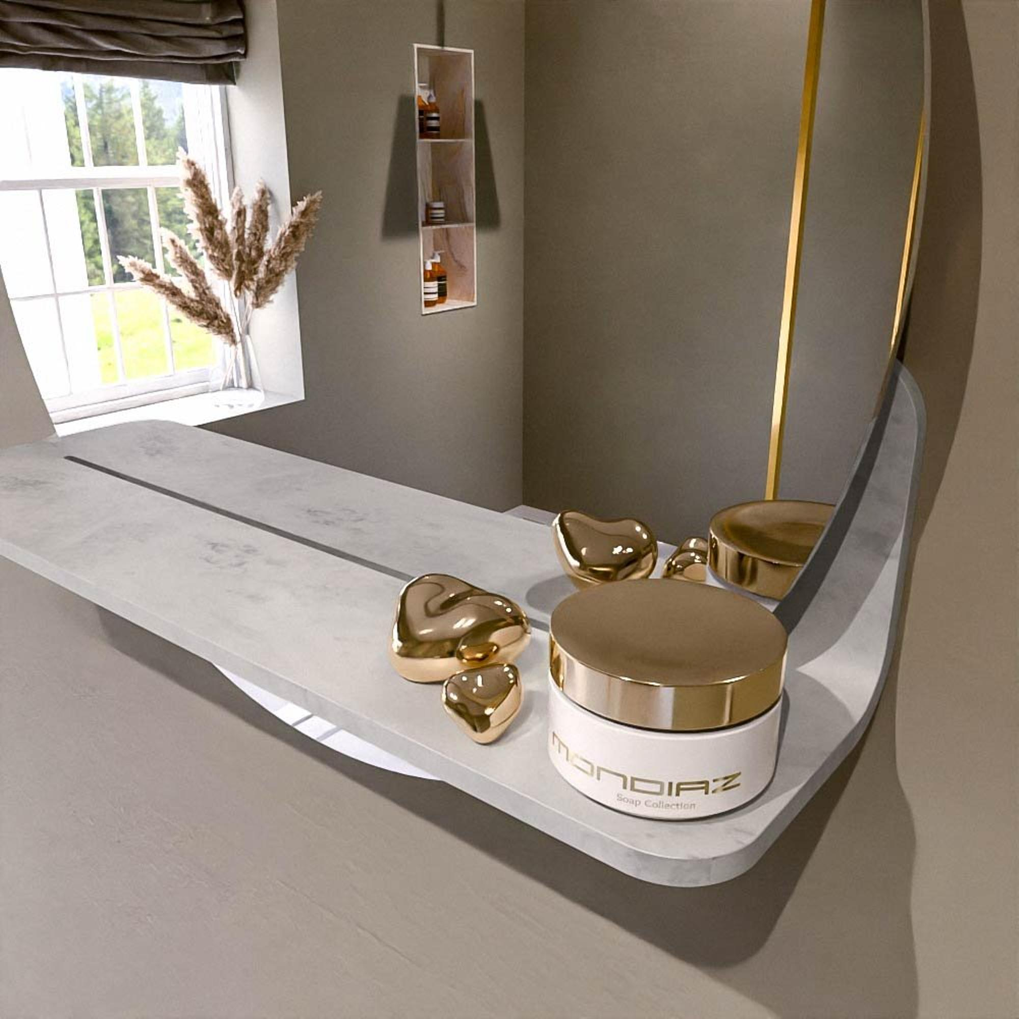 Het planchet, met zijn vloeiend afgeronde hoeken, biedt handige opbergruimte voor uw dagelijkse benodigdheden. De spiegel is subtiel verzonken in het planchet, wat zorgt voor een moderne en stijlvolle uitstraling.